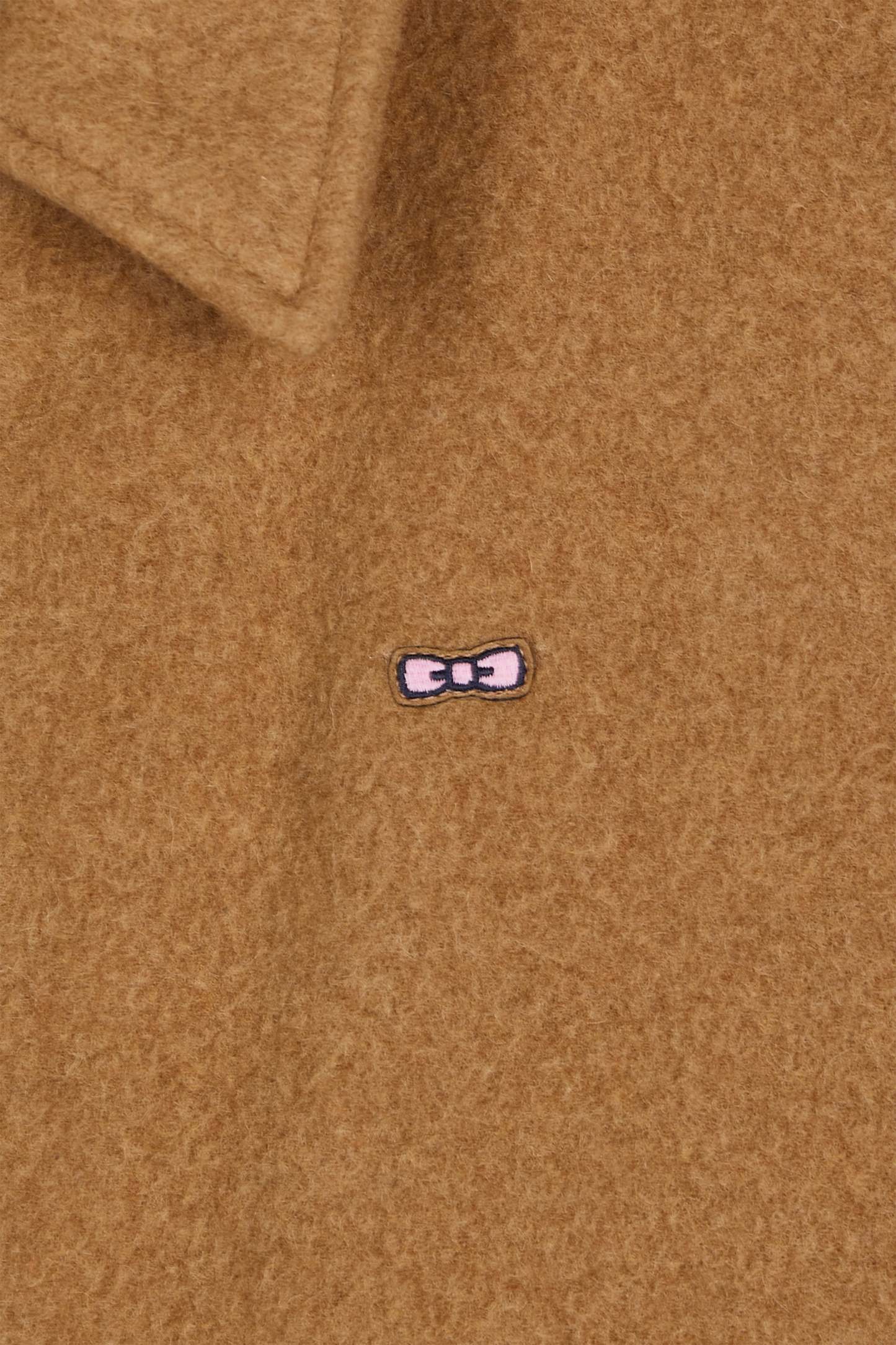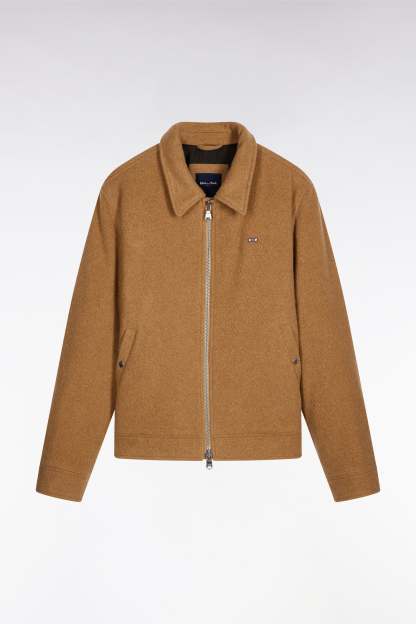 Épure et chaleur maîtrisée pour ce blouson en laine bouillie décliné en camel ou en marine. Sa coupe droite est structurée par un zip à double curseur en métal argenté et deux poches à rabat dotées de boutons pression. Doublure intérieure cerclée en camaïeux, finitions premium et nœud en gomme sur une base de feutre à la poitrine signent cette pièce à l’élégance minimaliste et intemporelle