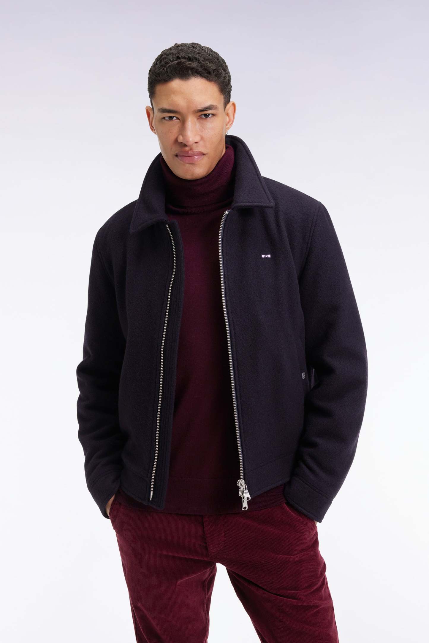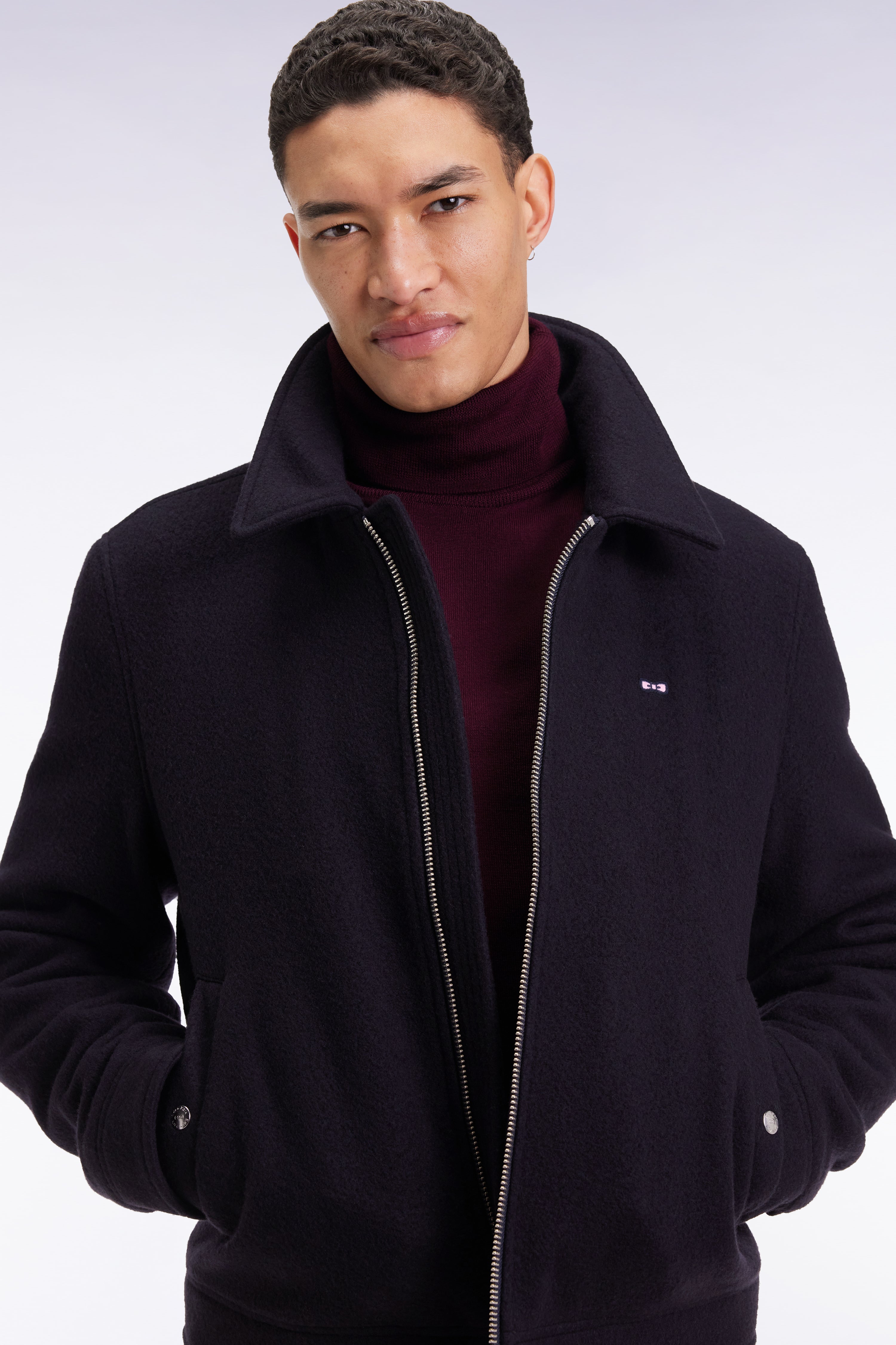 Épure et chaleur maîtrisée pour ce blouson en laine bouillie décliné en camel ou en marine. Sa coupe droite est structurée par un zip à double curseur en métal argenté et deux poches à rabat dotées de boutons pression. Doublure intérieure cerclée en camaïeux, finitions premium et nœud en gomme sur une base de feutre à la poitrine signent cette pièce à l’élégance minimaliste et intemporelle