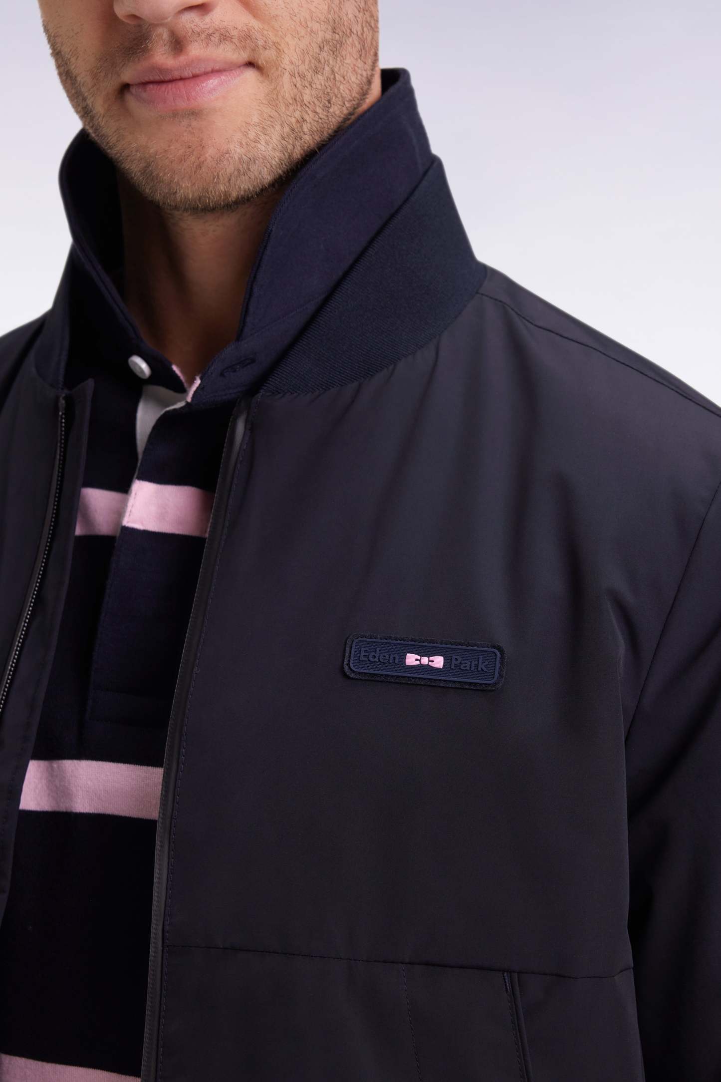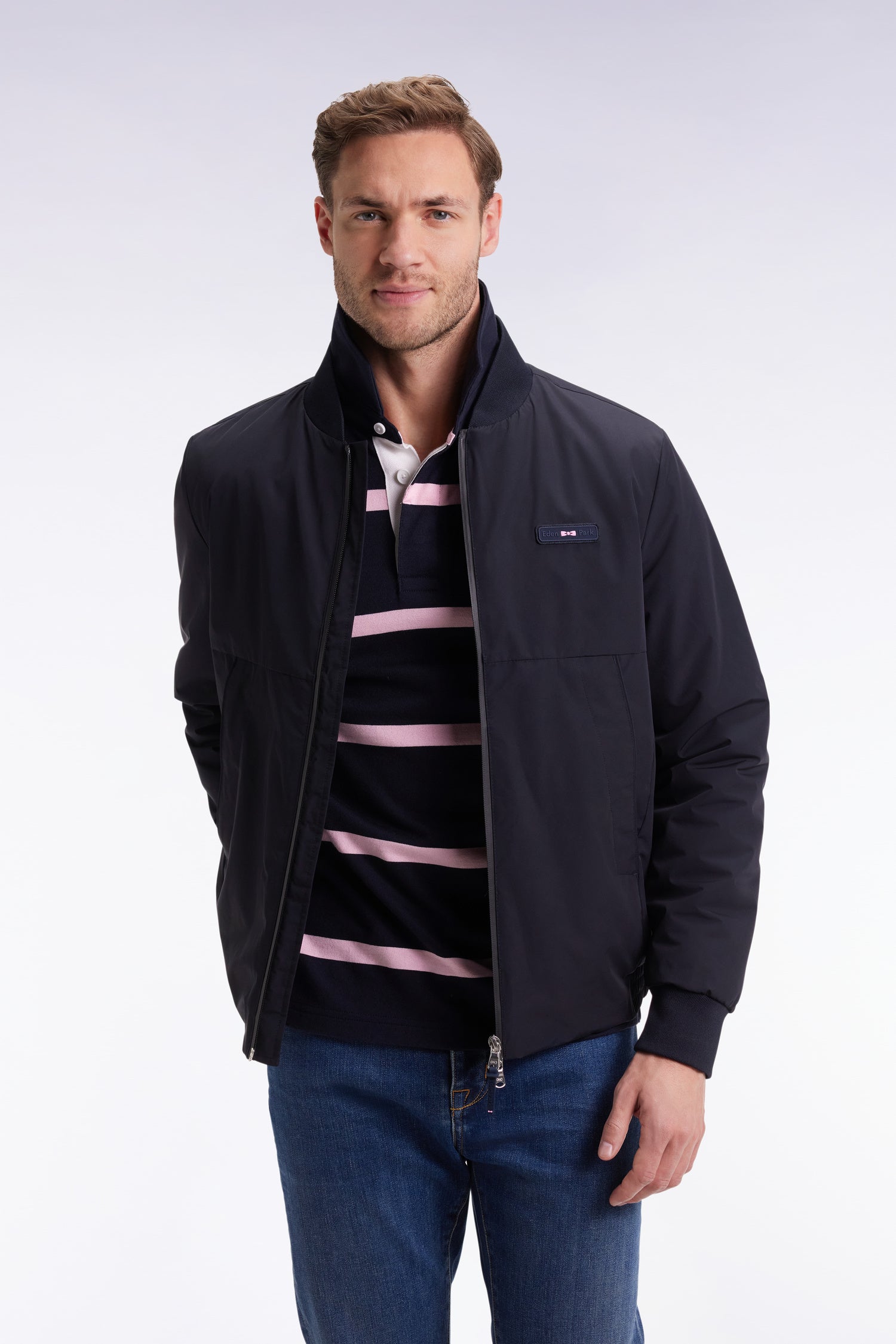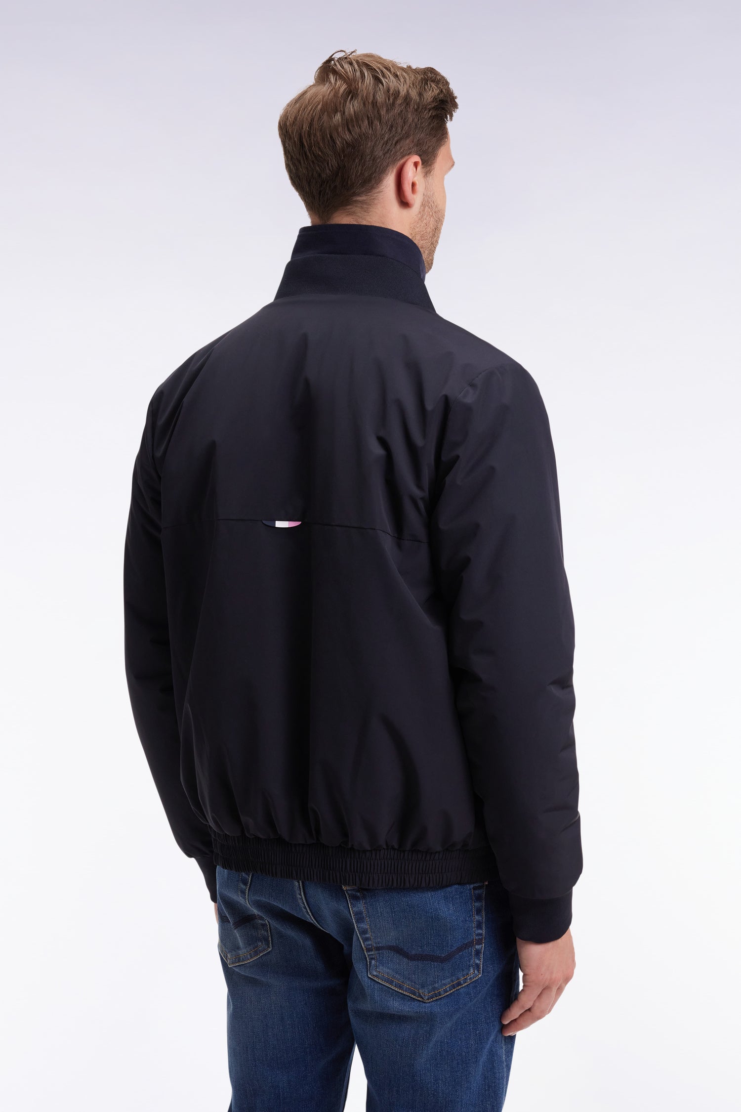 Élégance sportive et détails techniques pour ce blouson Starter marine en nylon doublé de nylon ouatiné. Le jeu de découpes sur le devant et le dos structure la silhouette, tandis que les finitions soignées : zip Aquagard, poches zippées passepoilées et bords-côtes en soulignent le caractère. L'inimitable touche Eden Park ? Un ruban tricolore subtilement glissé sous l’encolure et sa barrette logo en gomme !