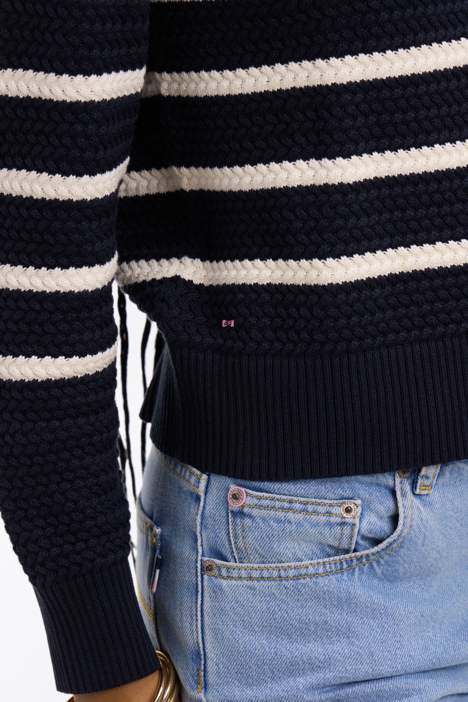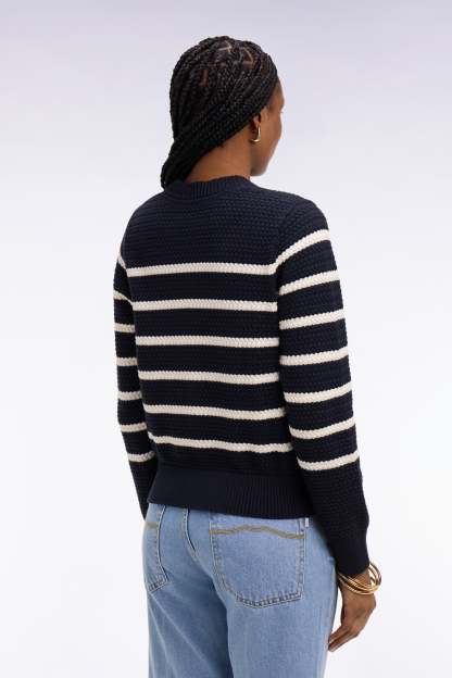 Ce cardigan d'inspiration marinière confectionné par nos ateliers en maille tressée en pur coton revisite un classique du vestiaire féminin avec une touche graphique et contemporaine plus estivale. Décliné en beige ou en marine, il séduit par son jeu de textures et ses rayures subtilement contrastées qui apportent profondeur et relief. Sa coupe confortable et ses finitions en bord-côtes structurent la silhouette féminine avec élégance. Porté ouvert sur le pull manches courtes assorti ou fermé avec un jean flaire, ce cardigan rayé compose des tenues féminines à la fois modernes et intemporels. Glissez ce cardigan dans votre valise pour réchauffer une soirée d'été venteuse.