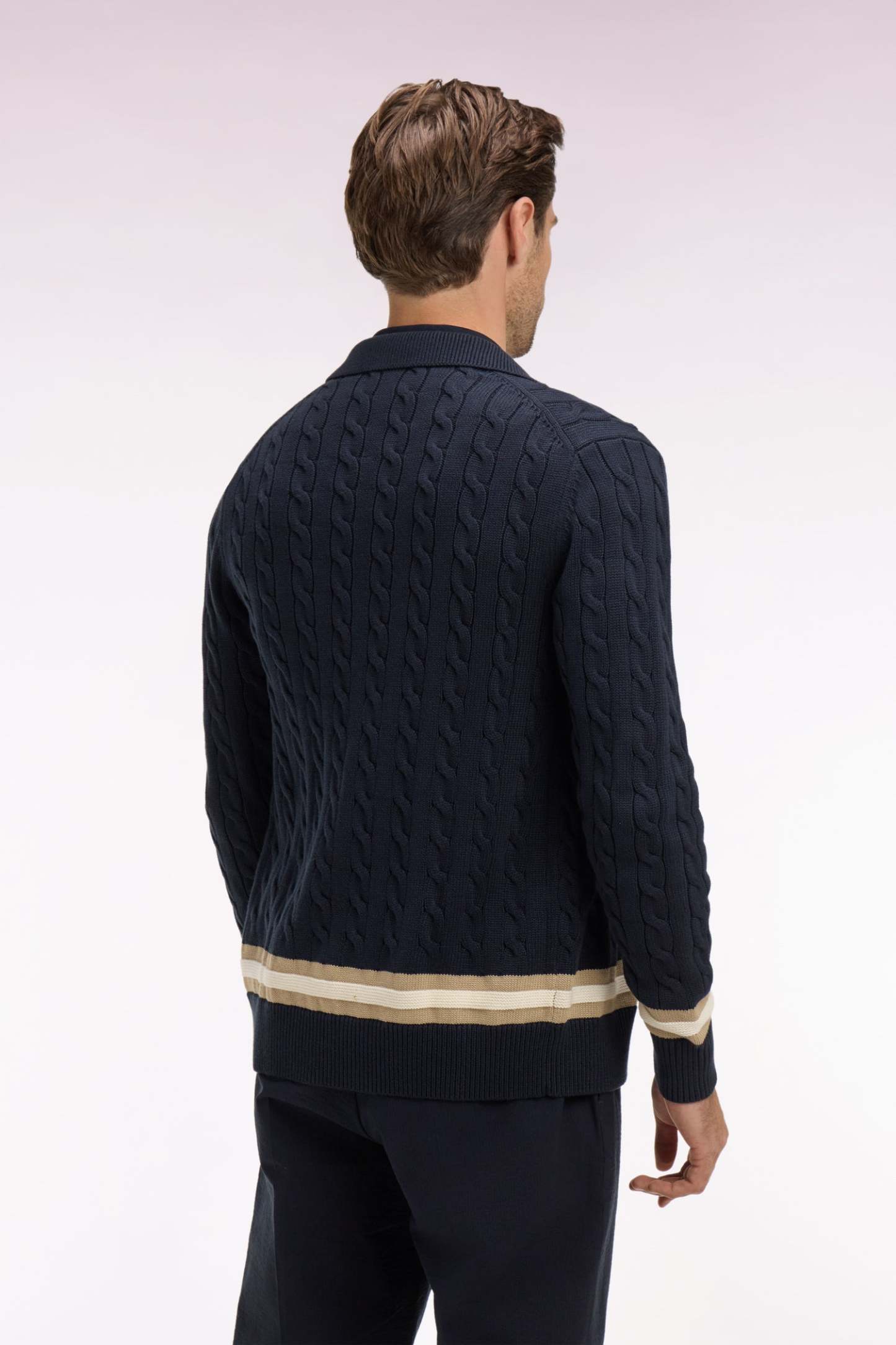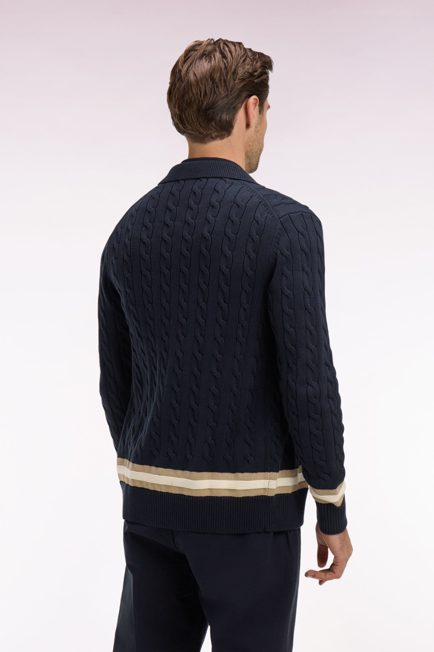 Inspiré des pulls cricket, ce cardigan pour homme en pur coton se distingue par son tricotage torsade et ses bords côtes soulignés de bandes rayées aux poignets et au bas de corps. Des détails soignés qui renforcent son élégance et son authenticité. Porté en pull ou en guise de veste de mi saison, ce gilet marine zippé à col polo s'accorde facilement à un jean.