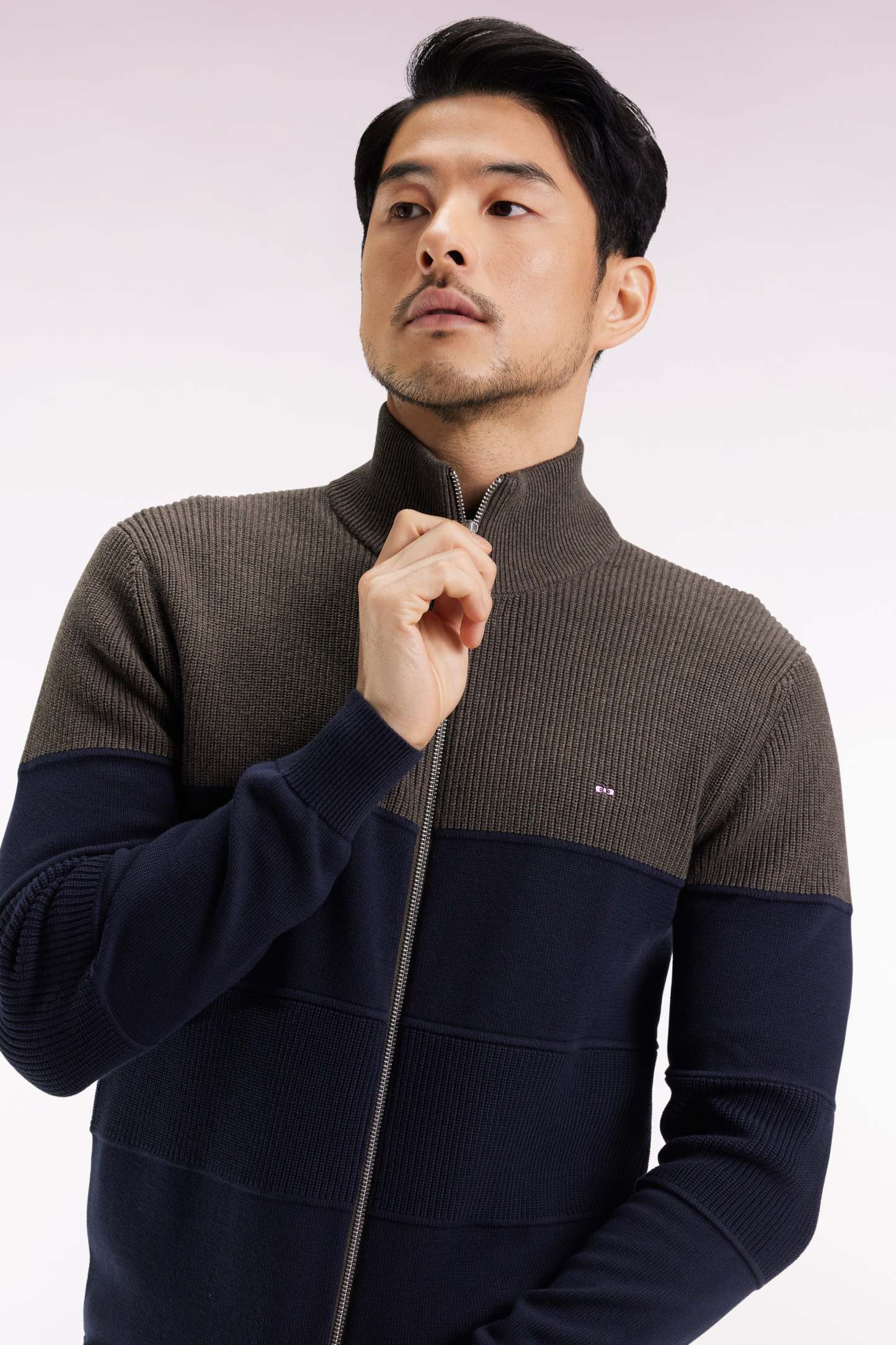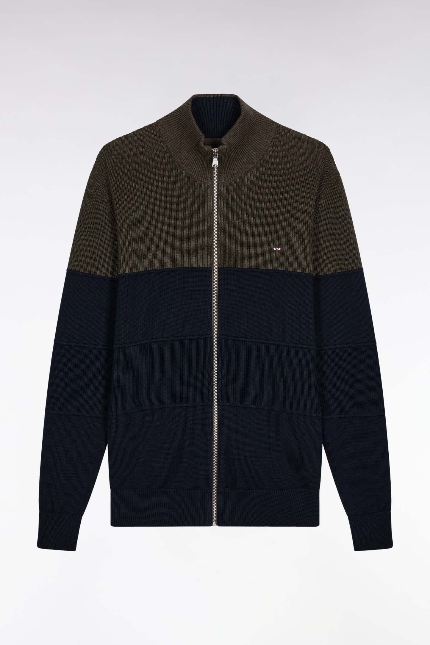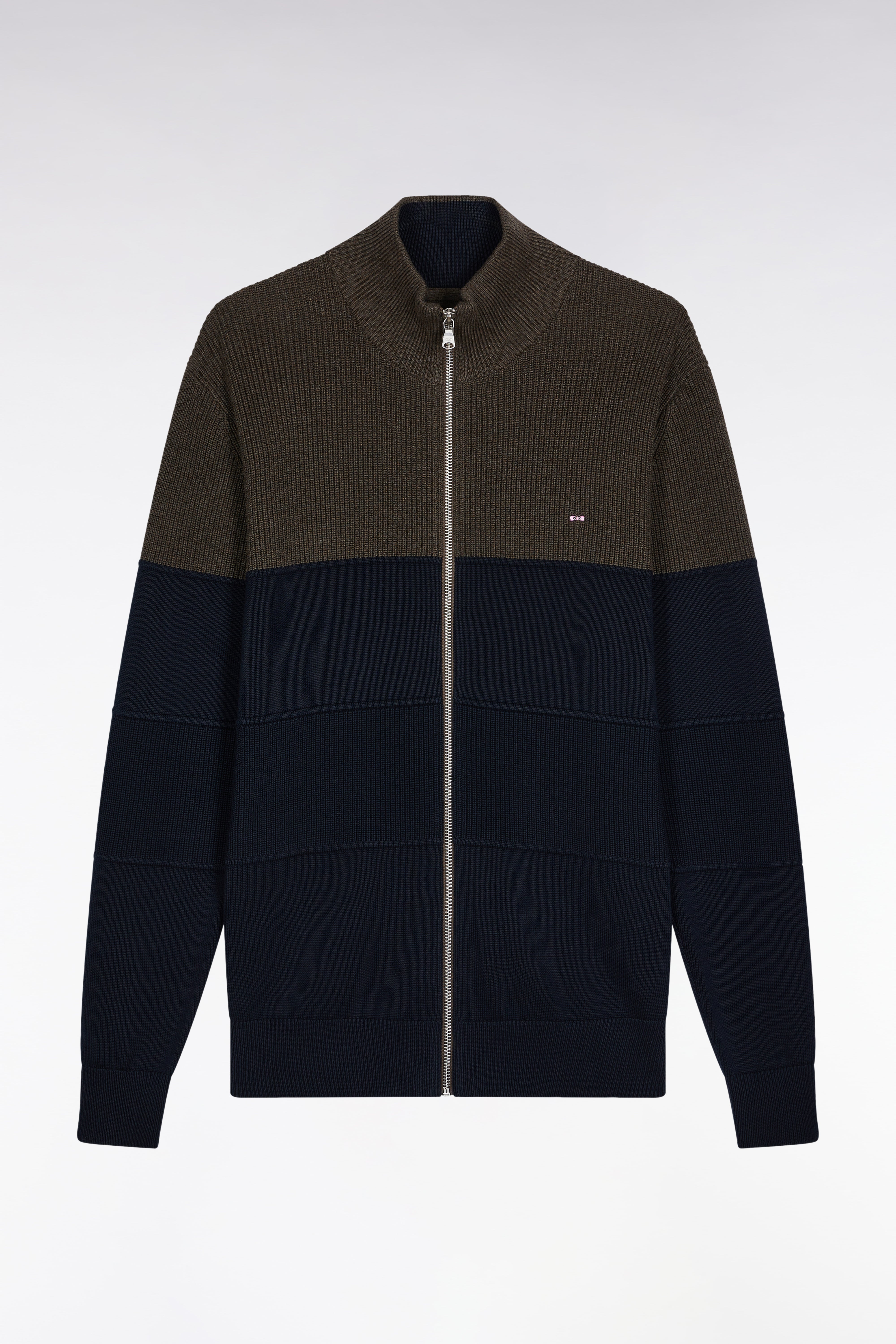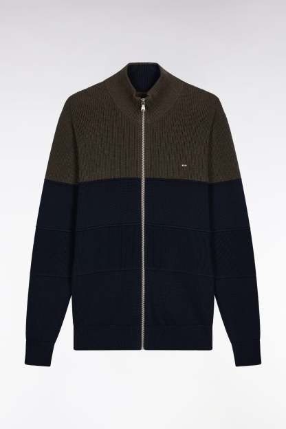 Cardigan zippé en coton bicolore marine et marron coupe droite