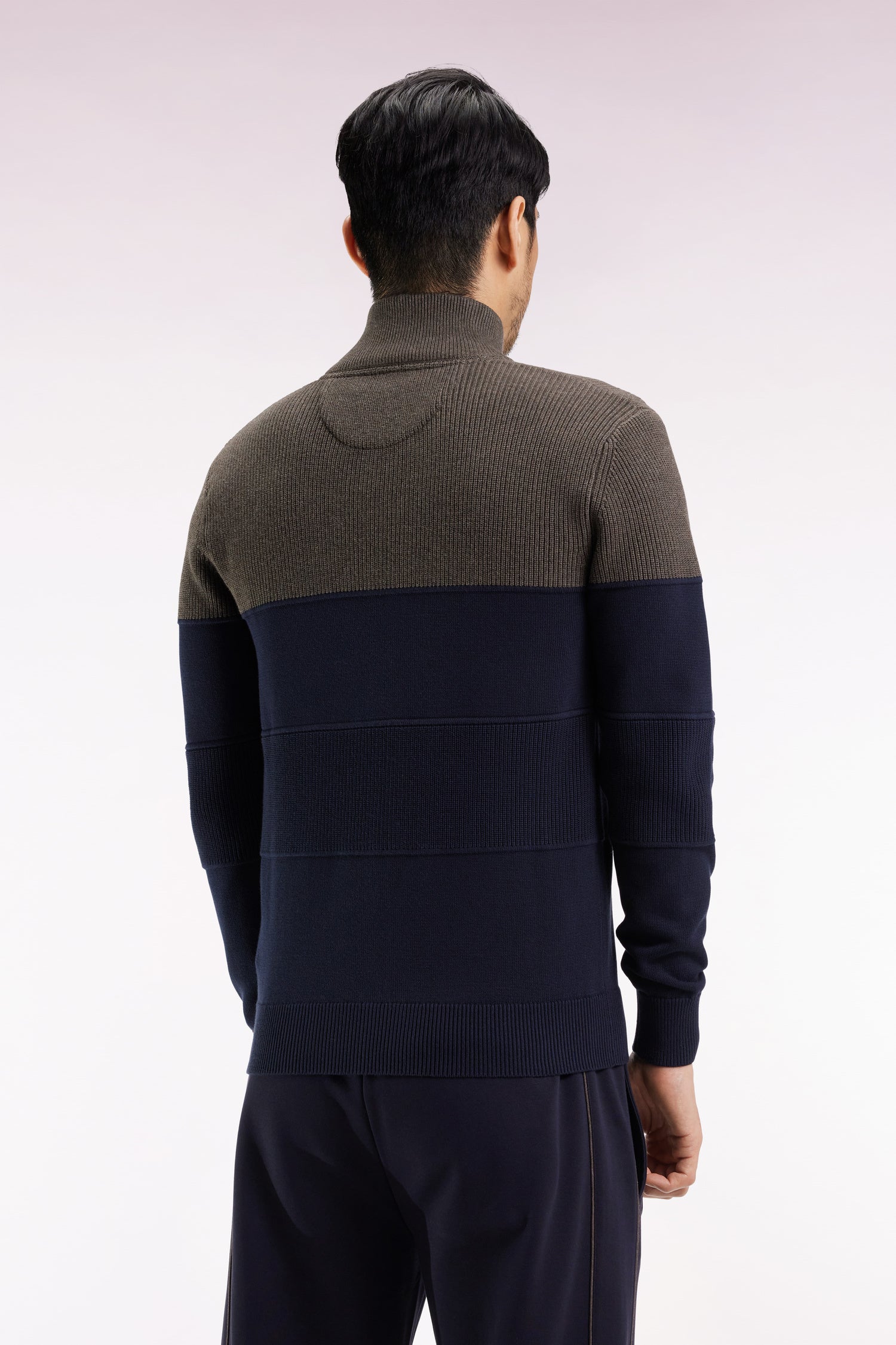 Ce cardigan zippé à col montant se distingue par son jeu de contrastes et de découpes subtiles. Bicolore, la maille alterne avec finesse les côtes anglaises et le jersey pour apporter du relief à la silhouette, sans en faire trop, un effet de rayure mis en valeur par la présence d'une jonction passepoilée. La broderie nœud papillon rose sur la poitrine signe cette pièce fidèle à l’héritage sport-chic de notre maison