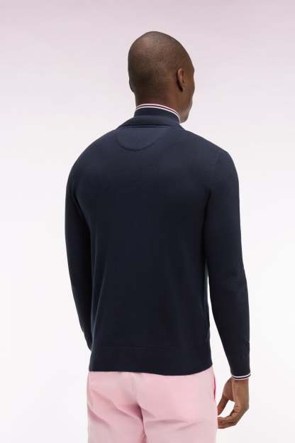 Ce cardigan homme allie à la perfection élégance et confort. Confectionné en coton tricoté dans un élégant point jersey, il est doté de bords-côtes tons sur tons soulignés de rayures roses et blanches, un rappel subtil de sa broderie nœud papillon, l'emblème iconique de notre Maison française. Le col montant et les finitions soignées apportent une touche moderne à ce modèle masculin facile à porter au quotidien.
