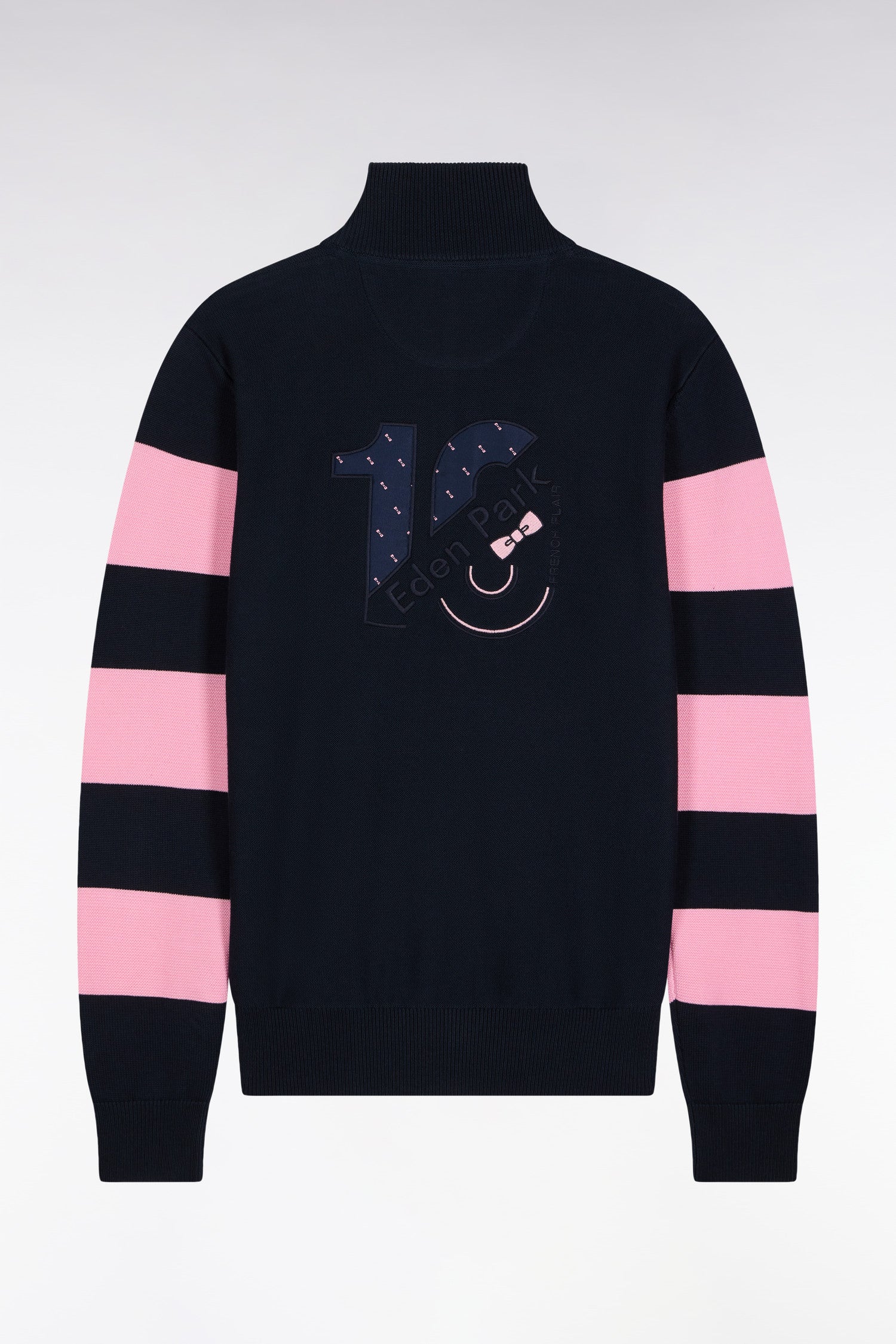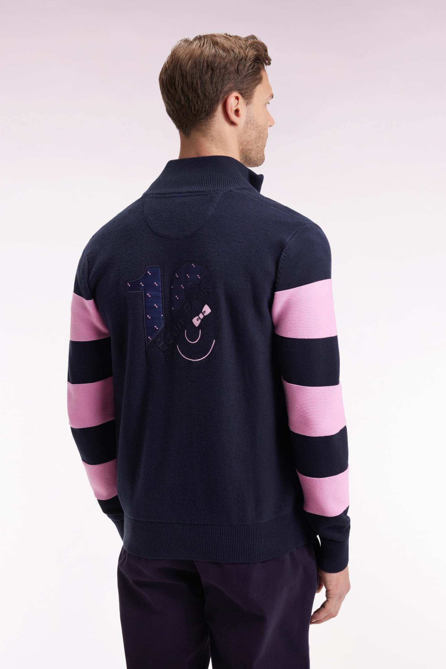 Rugby dans l’âme, raffinement dans l’attitude : Eden Park trace dans le paysage de la mode masculine une ligne unique, toujours reconnaissable. Avec ses larges rayures roses façon maillot de rugby, ce cardigan zippé à col montant bleu marine revisite le vestiaire Eden Park dans une version sport-chic assumée. Réalisé en coton tricoté, il joue sur les contrastes avec ses manches cerclées en point différent et son intérieur de col élégamment coloré. La broderie nœud papillon rose sur la poitrine signe cette pièce iconique révélant à l'arrière une broderie aux codes de la maison