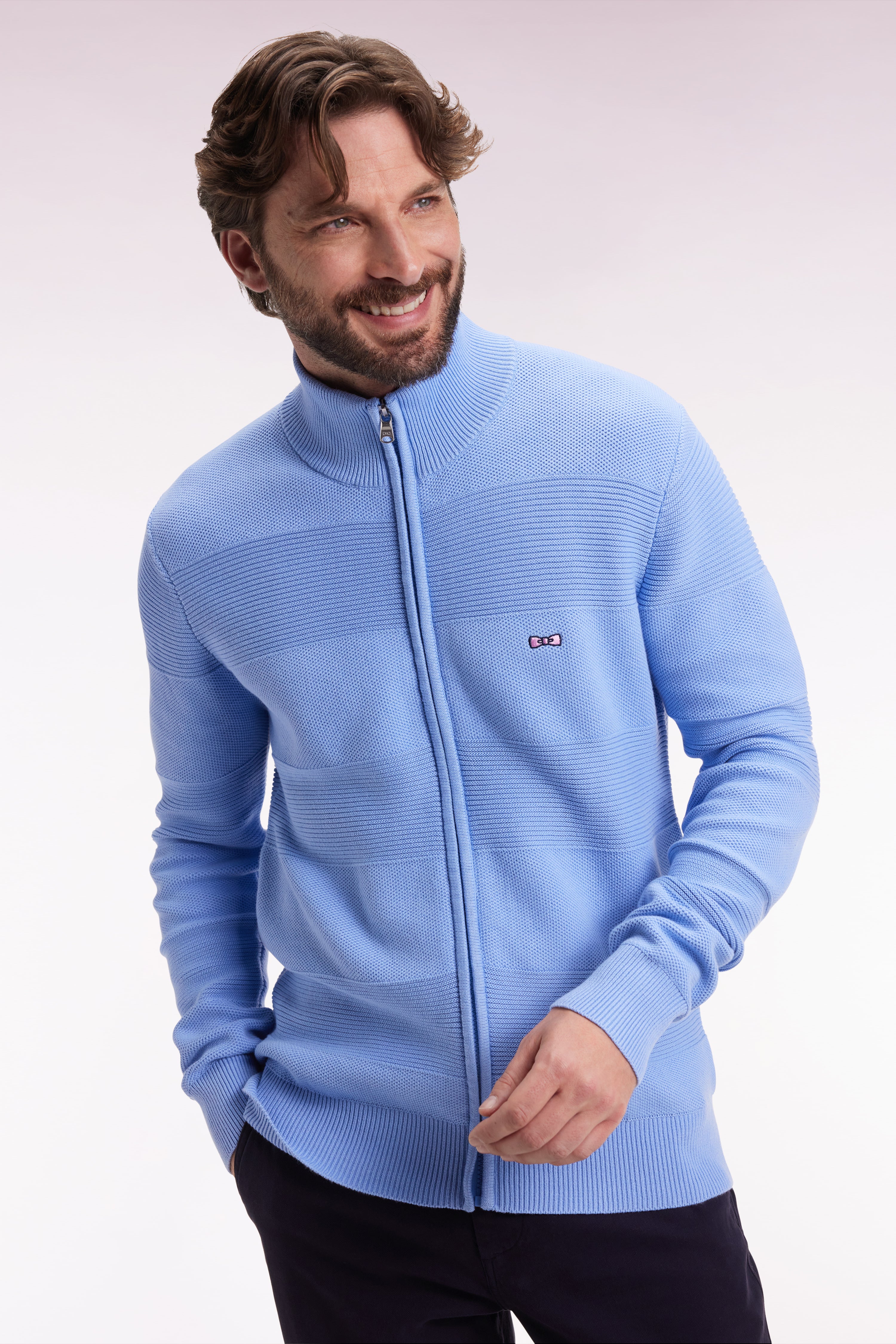 Cardigan zippé en coton nid d'abeille ciel coupe droite
