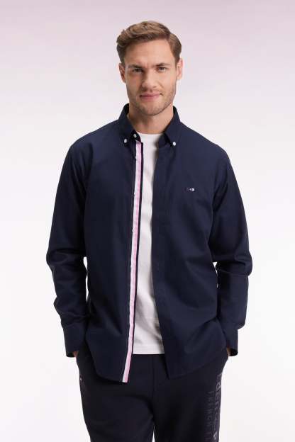 Cette chemise masculine à l’esprit French Flair affirme son caractère jusque dans ses moindres détails. Réalisée dans un coton à armure pinpoint, elle se distingue par un ruban tricolore apposé à l’encolure dos et par ses même finitions contrastées au niveau de la patte de boutonnage, du col et des poignets. Fidèle à l’ADN de la maison, cette chemise arbore une broderie d'inspiration rugby dans le dos et l'emblème nœud papillon Eden Park brodé sur la poitrine, ici décliné dans des couleurs tricolores variant selon le coloris choisi. Une pièce forte du vestiaire masculin, à la silhouette nette et contemporaine