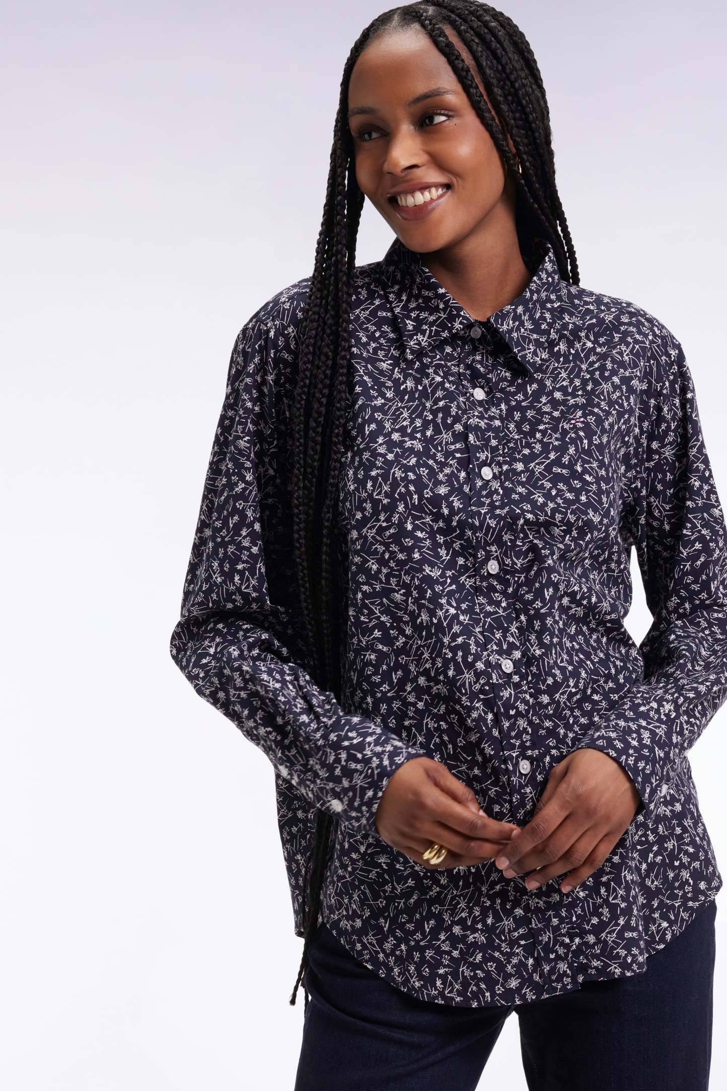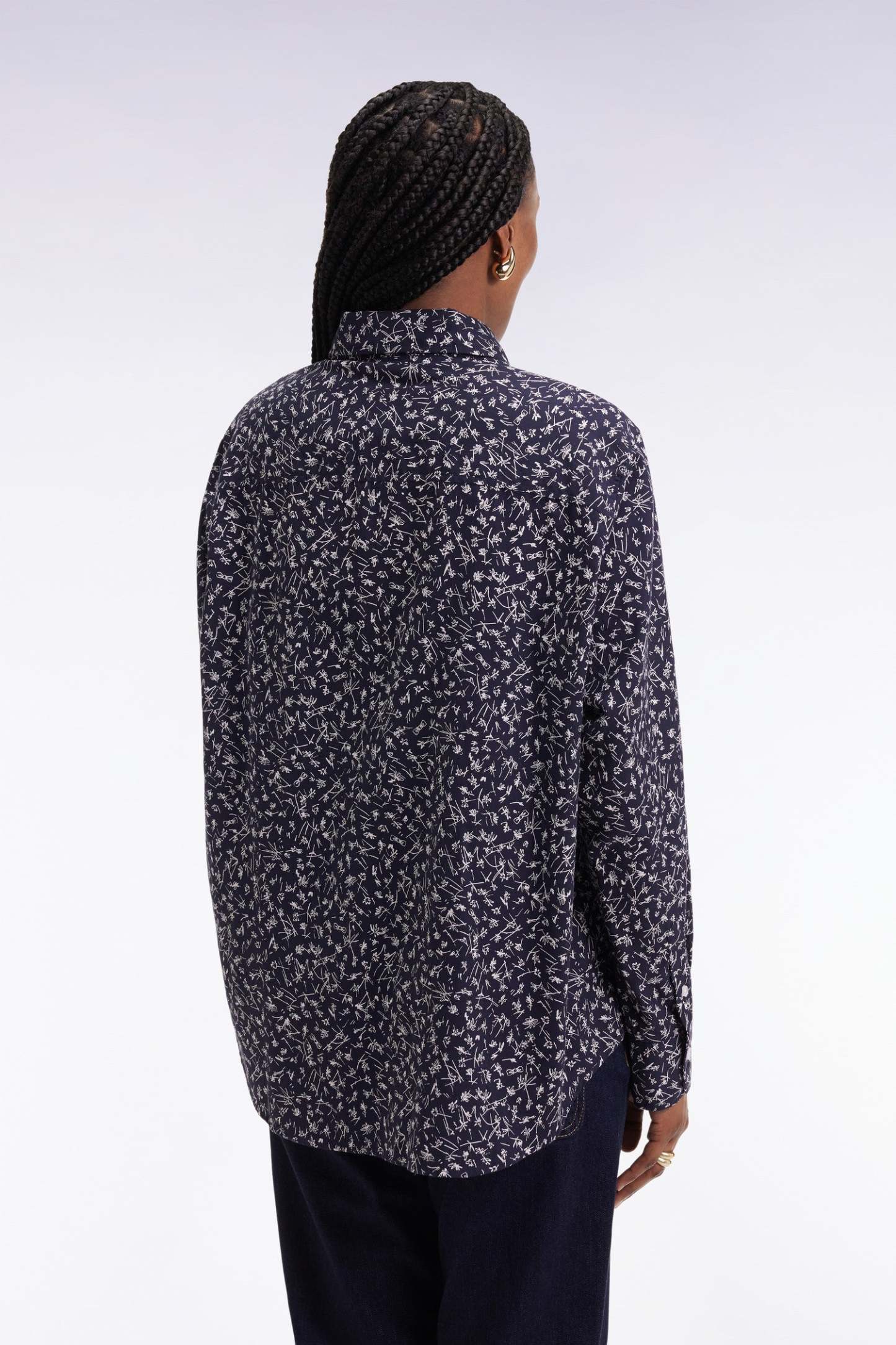 Cette chemise femme en popeline de coton marine se distingue par sa coupe slim ajustée et ses micro-motifs discrets. Son imprimé, exclusivement dessiné pour notre maison lui confère une touche graphique tendance et original. Un modèle féminin et structuré, parfait pour twister les classiques avec subtilité