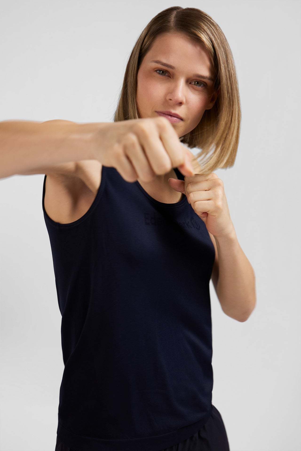Ce débardeur exclusif à notre capsule sport vendue en ligne est l'allié parfait pour vos activités. Confectionné en polyamide respirant, ce débardeur femme vous offre une liberté de mouvement inégalée, que ce soit pour le yoga, le fitness ou la course à pied. Sa coupe seyante et ses coloris bleu marine ou kaki ajoutent une note d'élégance à votre tenue de sport. Portez ce débardeur orné d'une sérigraphie ton sur ton discrète avec son jogging ou son cycliste assorti au gré de vos entrainements.
