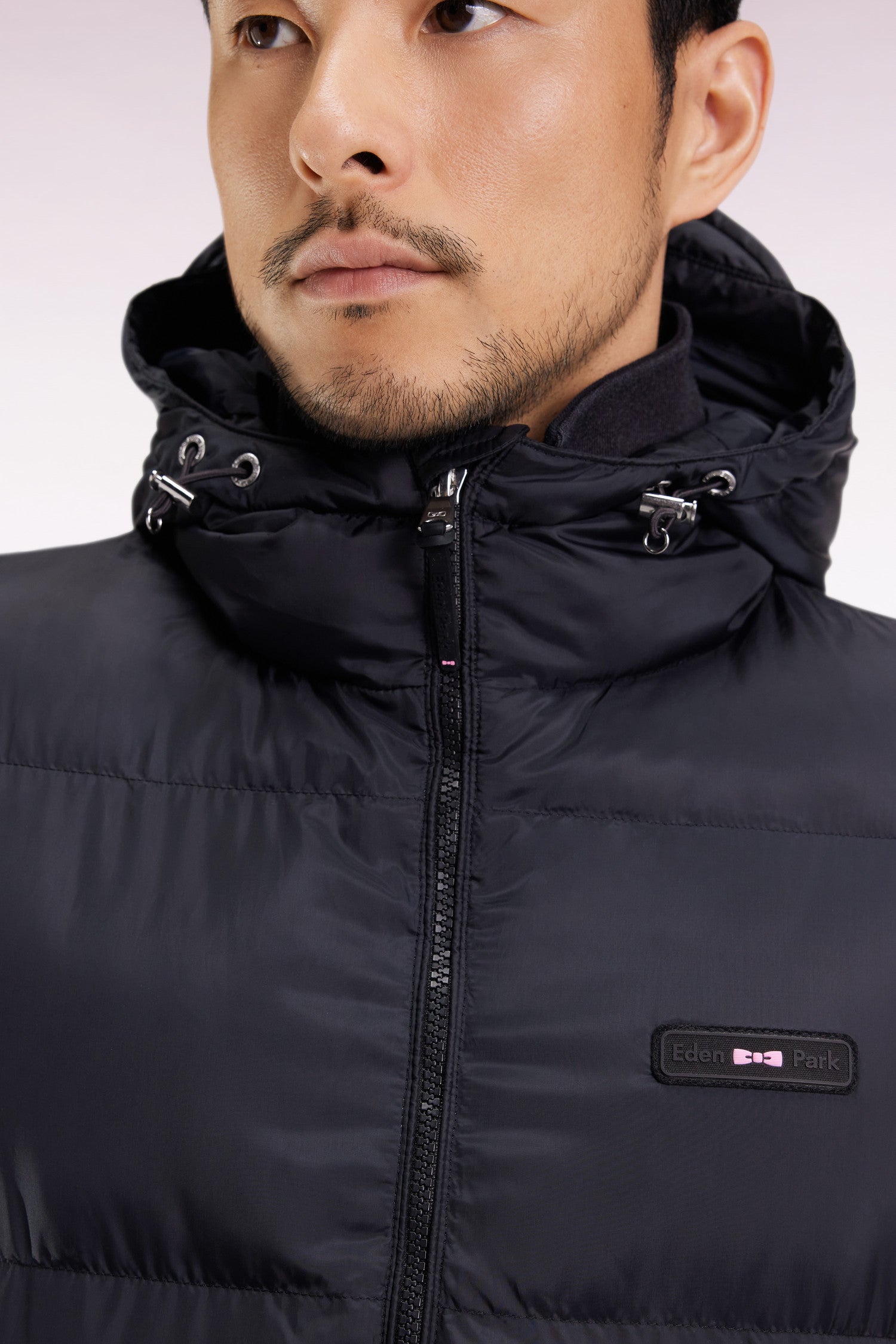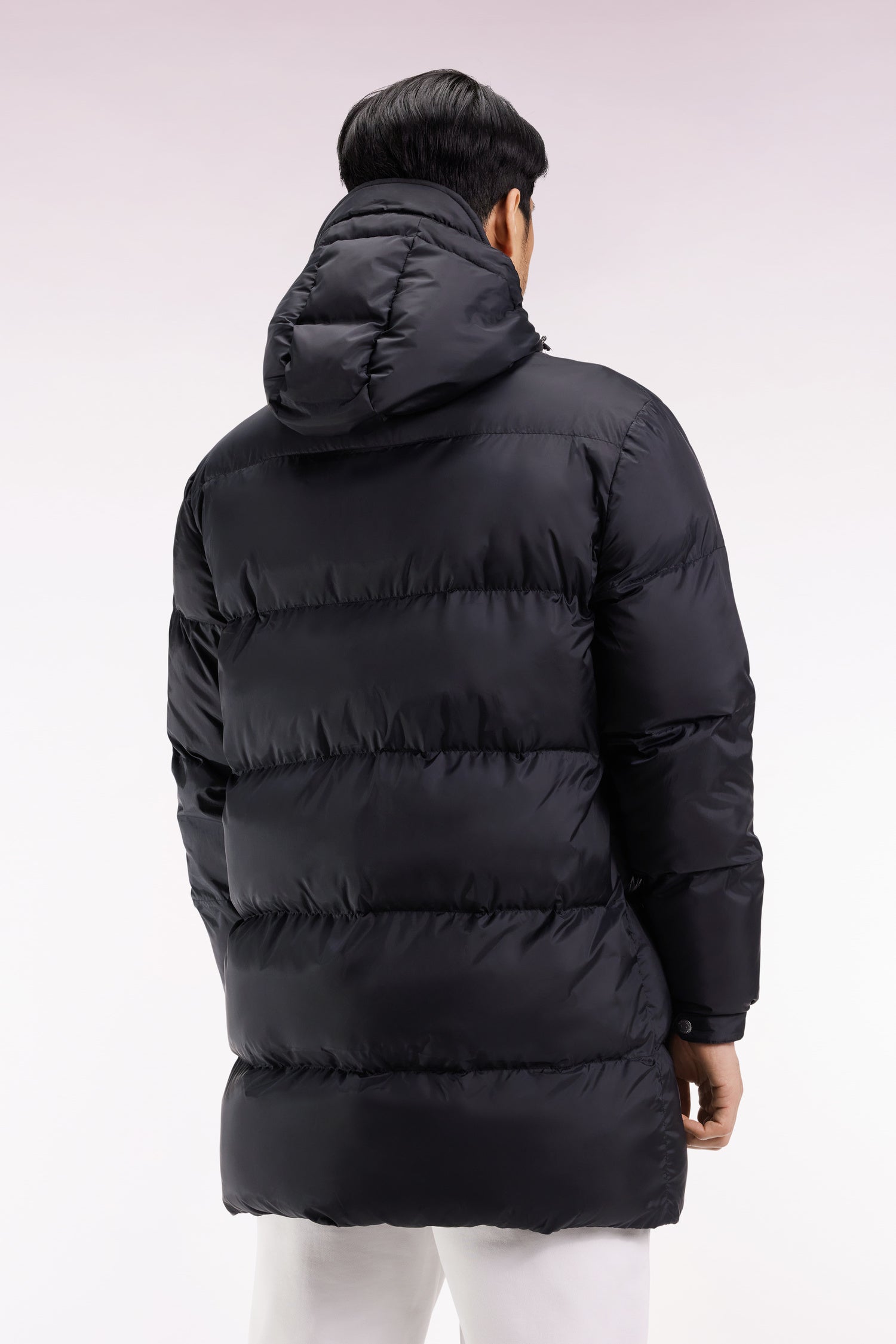 Pensée par notre studio de création pour affronter l’hiver avec style, cette doudoune longue à capuche intégrée séduit par son volume généreux et son matelassage large au fini subtilement brillant. Déclinée en noir ou en marine, cette doudoune homme allie protection et élégance avec ses zips en métal argenté, ses poignets élastiqués à patte pressionnée et ses finitions emblématiques : ruban tricolore sous l’encolure et barrette logo en gomme sur la poitrine
