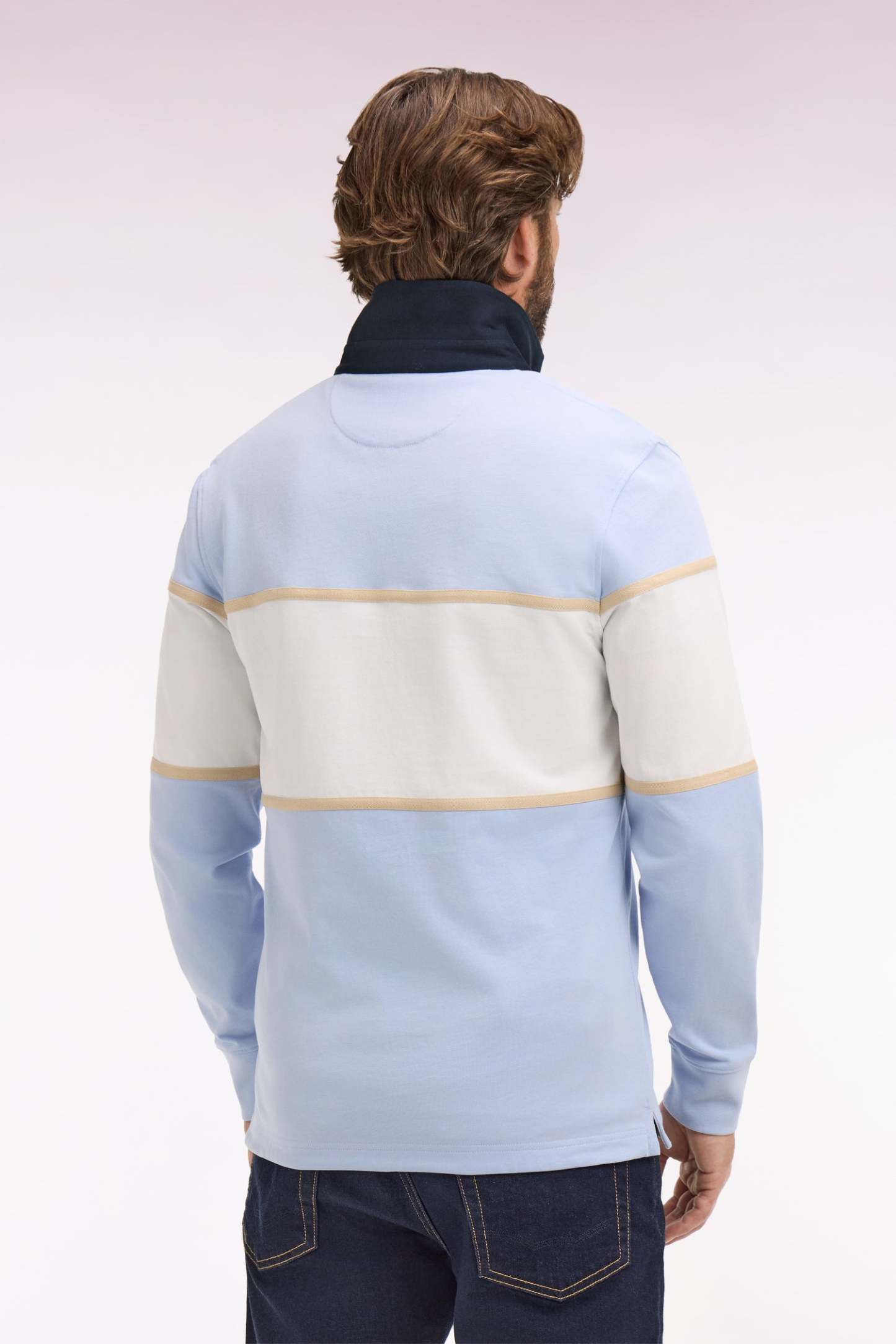 Ce maillot à manches longues en coton écru ou ciel s’impose par son allure sport chic inspirée de l’esprit Ivy League. Sa large bande contrasté, rose ou écru selon le modèle choisi, et son col marine apportent un contraste élégant et graphique, tandis qu’une broderie sérigraphiée Eden Park French Flair au style vintage souligne son caractère affirmé. Confectionné avec soin dans une étoffe douce, respirante et résistante, ce modèle revisite le maillot de rugby classique avec une touche mode et contemporaine.