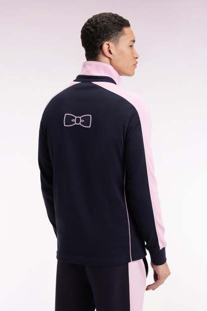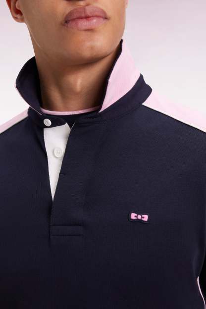Ce maillot en coton marine arbore des manches longues et un dessous de col à découpes roses soulignées d'un passepoil blanc. Au dos, ce modèle affiche son ADN French Flair avec une large broderie reprenant les contours de notre emblème : le nœud papillon. Sa coupe droite favorise confort et jeux de superposition