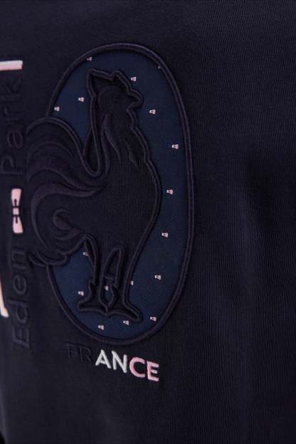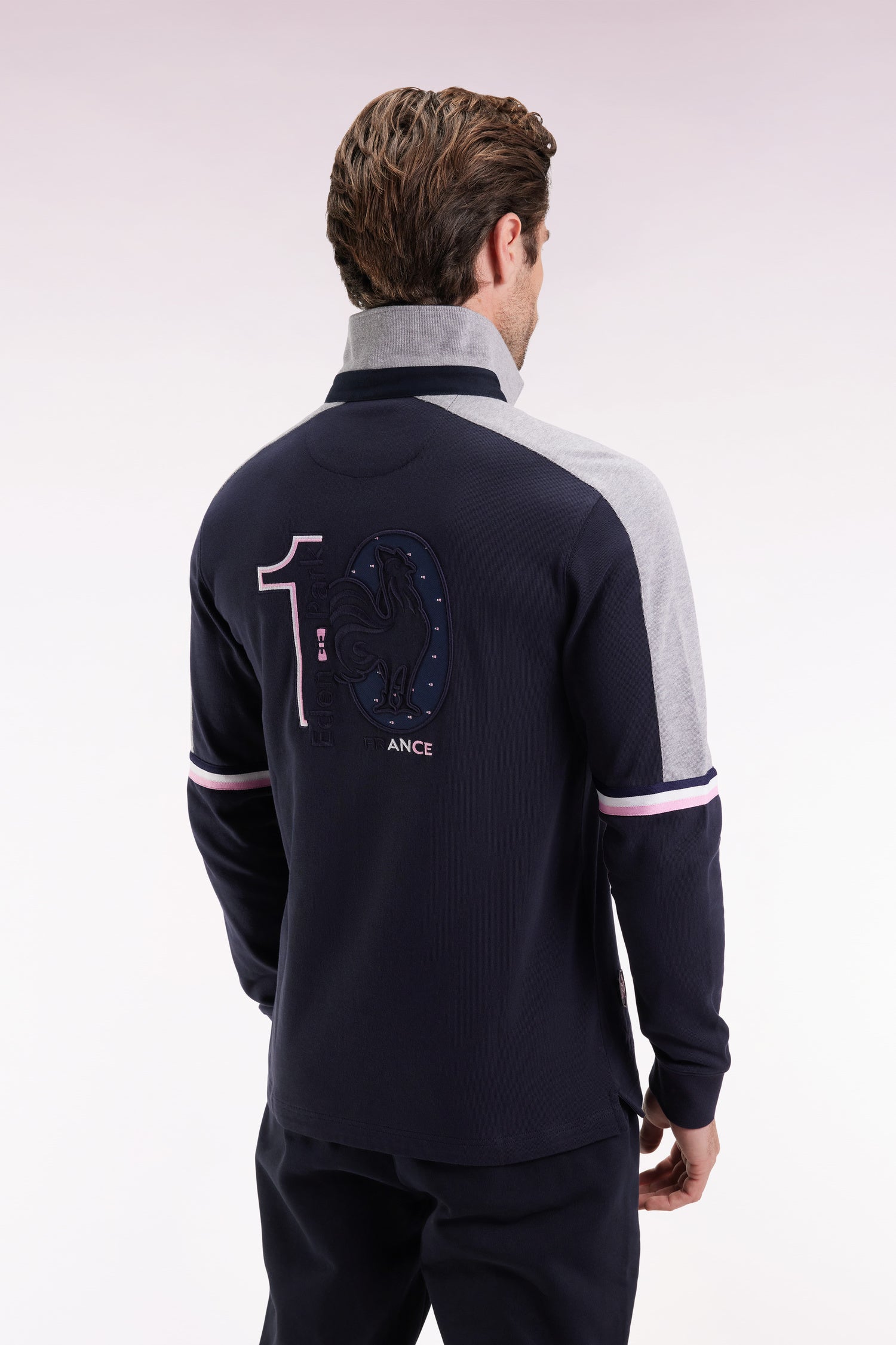 Ce maillot homme rend hommage au XV de France avec style. Réalisé en jersey de coton doux et épais, il mêle confort et robustesse. Les manches à découpes contrastées sont rehaussées de galons tricolores, tandis que le dos se distingue par une broderie signature avec incrustation de tissu cravate. Col en twill, dessous de col tricoté, et boutons rugby personnalisés complètent cette pièce signature à l’esprit French Flair indéniable. Chaque détail, du tissu choisi aux coutures soignées, incarne l’art de vivre à la française, entre allure contemporaine et héritage rugby