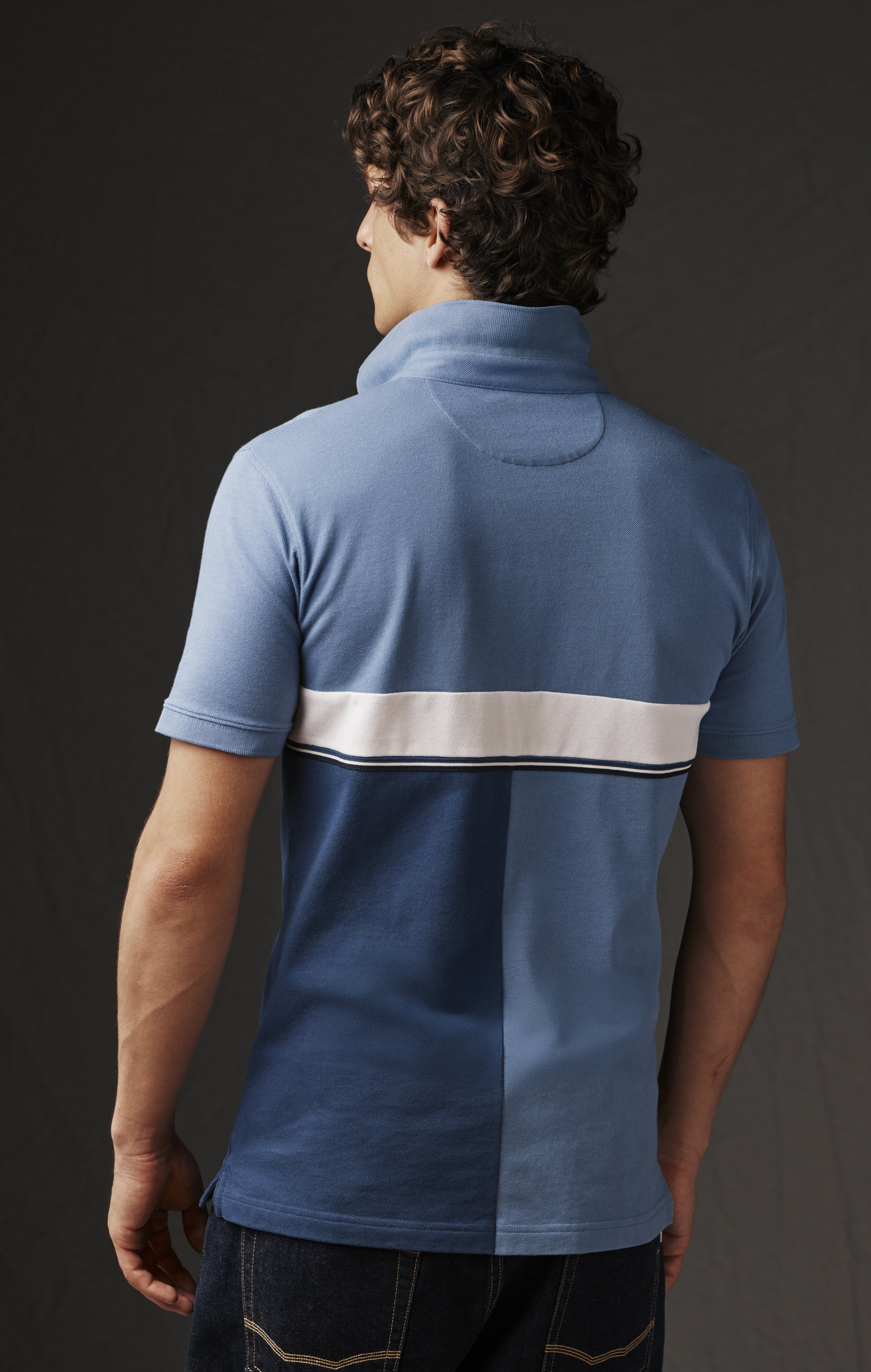Pour ce maillot manches courtes de notre nouvelle capsule Pap’Atelier, notre atelier parisien a imaginé un jeu graphique en miroir d'un second modèle. L'un et l'autre sont conçus à partir de deux maillots en jersey de coton stretch, l’un bleu clair, l’autre bleu foncé, soigneusement prélevés dans nos archives. Chaque modèle associe ces teintes en inversant leur placement pour créer un contraste inédit. Découpés puis réassemblés en patchwork, les panneaux sont rehaussés d’un galon rayé et d’une bande blanche, tous deux issus de nos stocks dormants. Ce modèle au haut du corps bleu clair unique, disponible uniquement en taille M et en un seul exemplaire sur notre site pour une durée limitée, illustre l’engagement d’Eden Park à sublimer chaque ressource et à proposer une mode durable au style singulier.