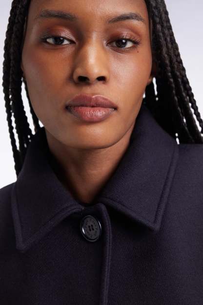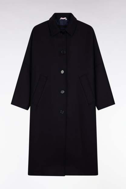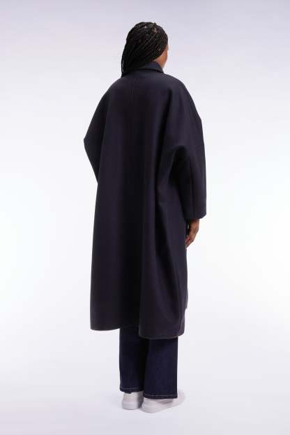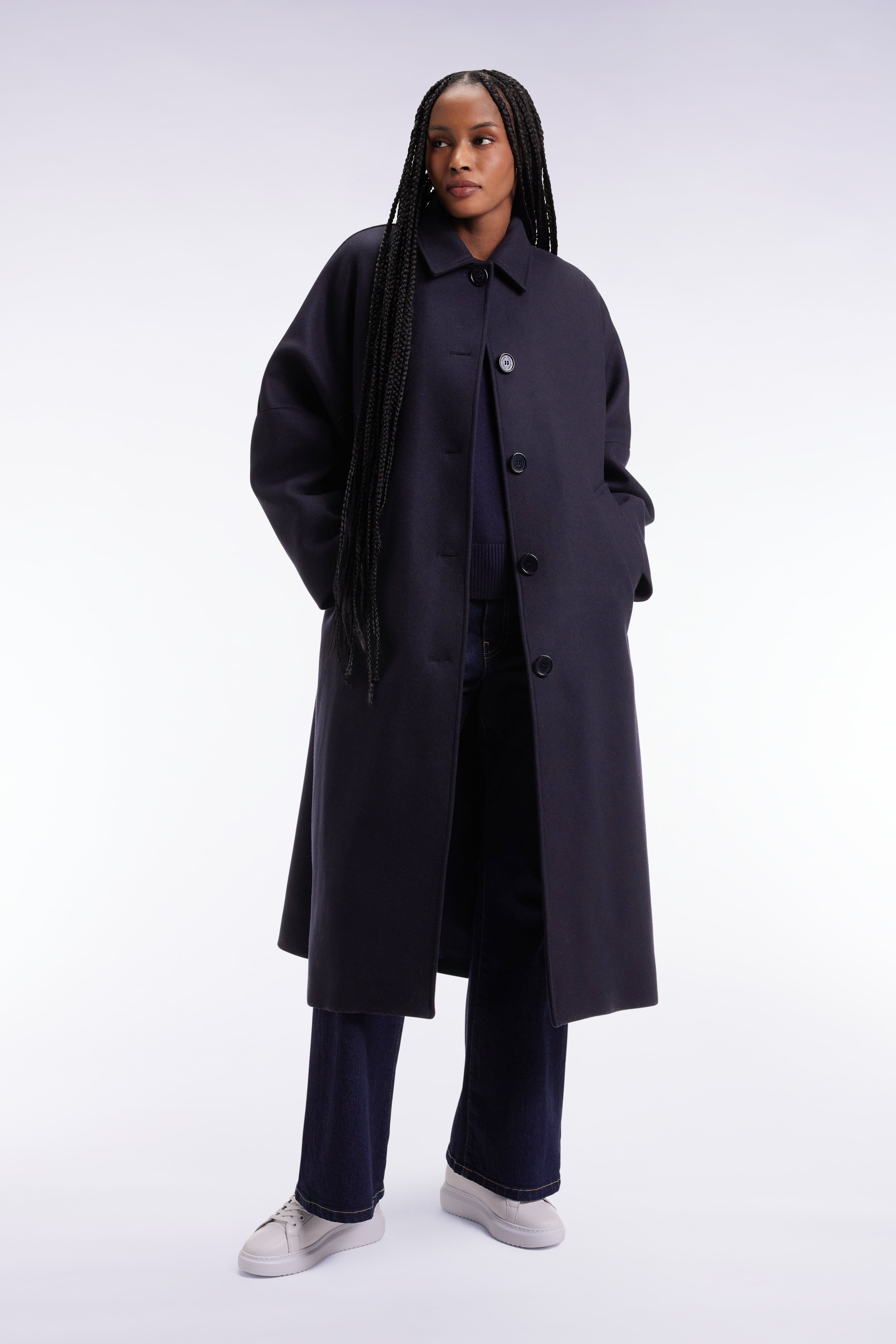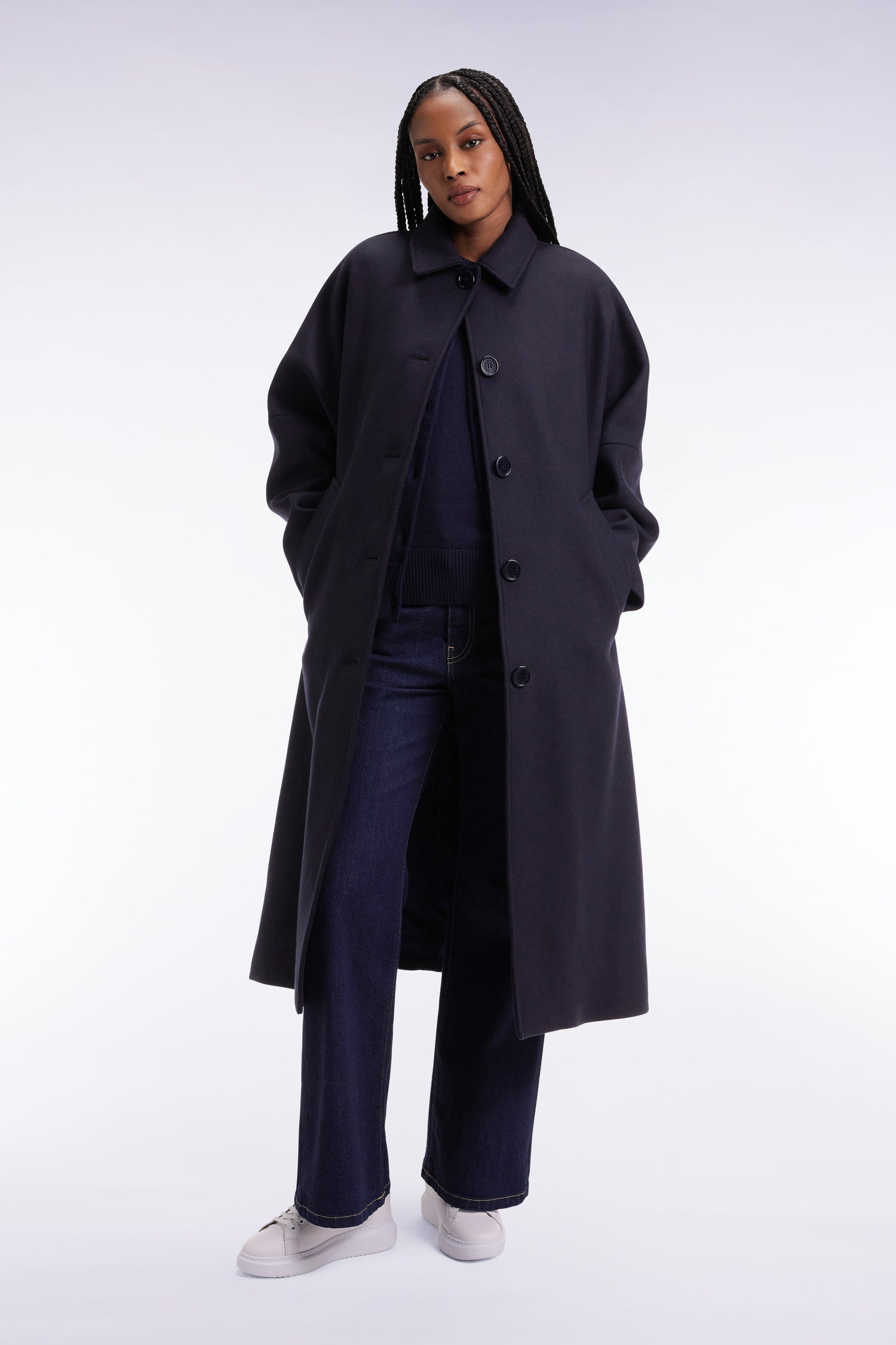 Ce manteau femme en twill de laine double face marine propose une approche minimaliste et sculpturale de féminine grâce à sa coupe ample et épurée inspirée des kimonos aux manches chauve-souris. Ce pardessus en pur laine affirme un style pointu et sophistiqué souligné par son emmanchure basse et sa coupe évasée. Les boutons ovales siglés Eden Park ponctuent la fermeture, tandis que les poches larges soulignent la sobriété graphique et la fonctionnalité de ce manteau intemporel où il fait bon se lover. Une pièce forte pensée avec précision, dans le respect des codes Eden Park.