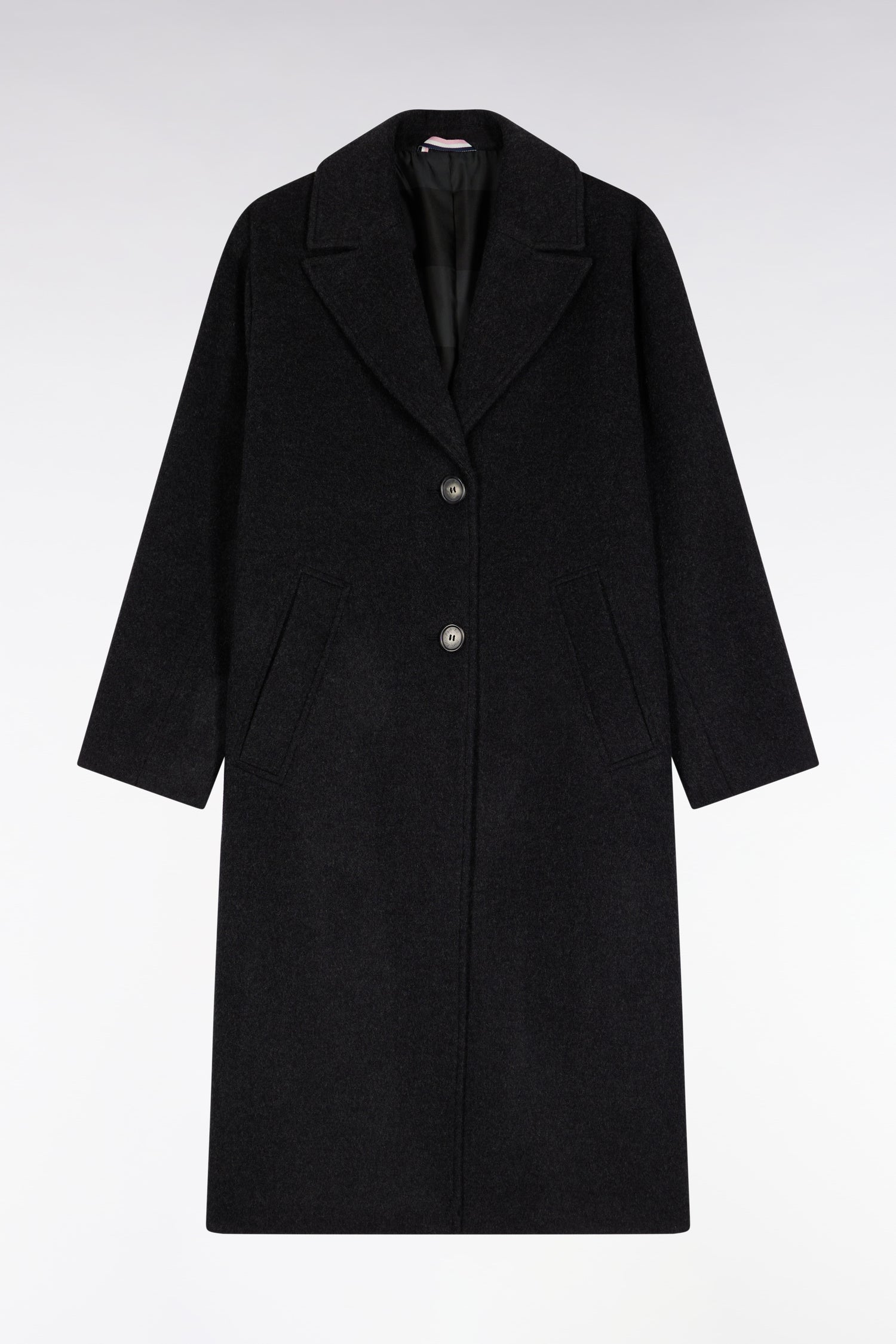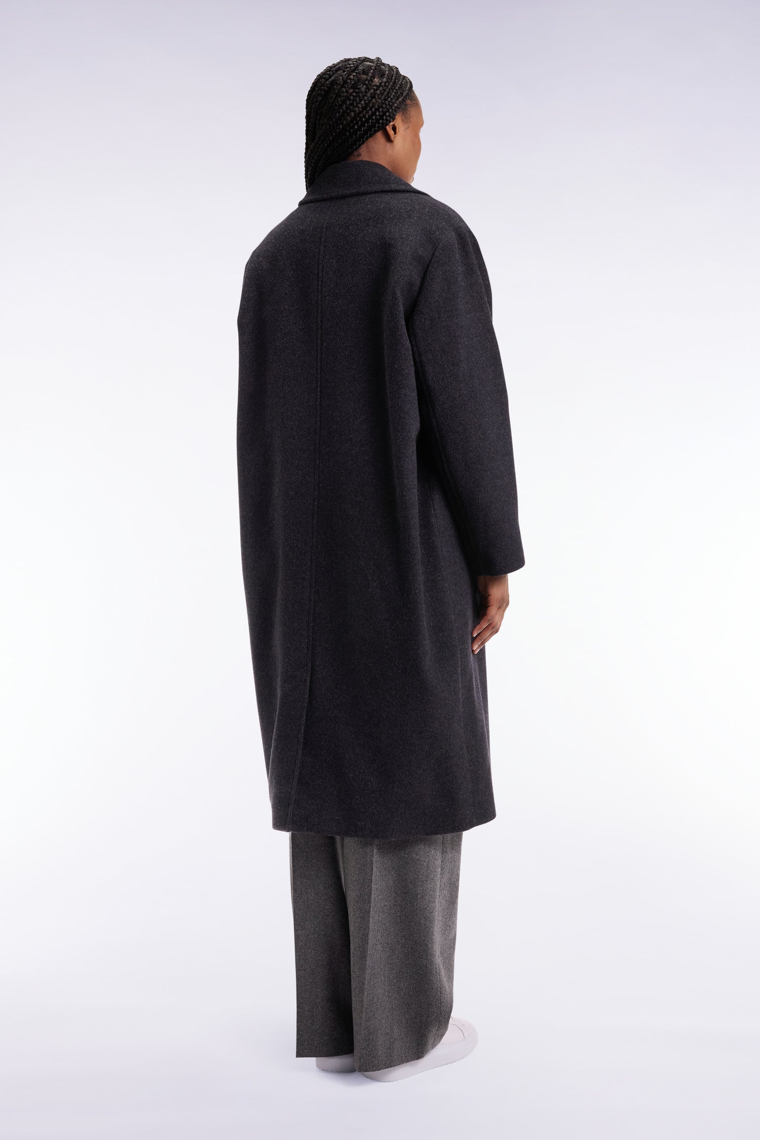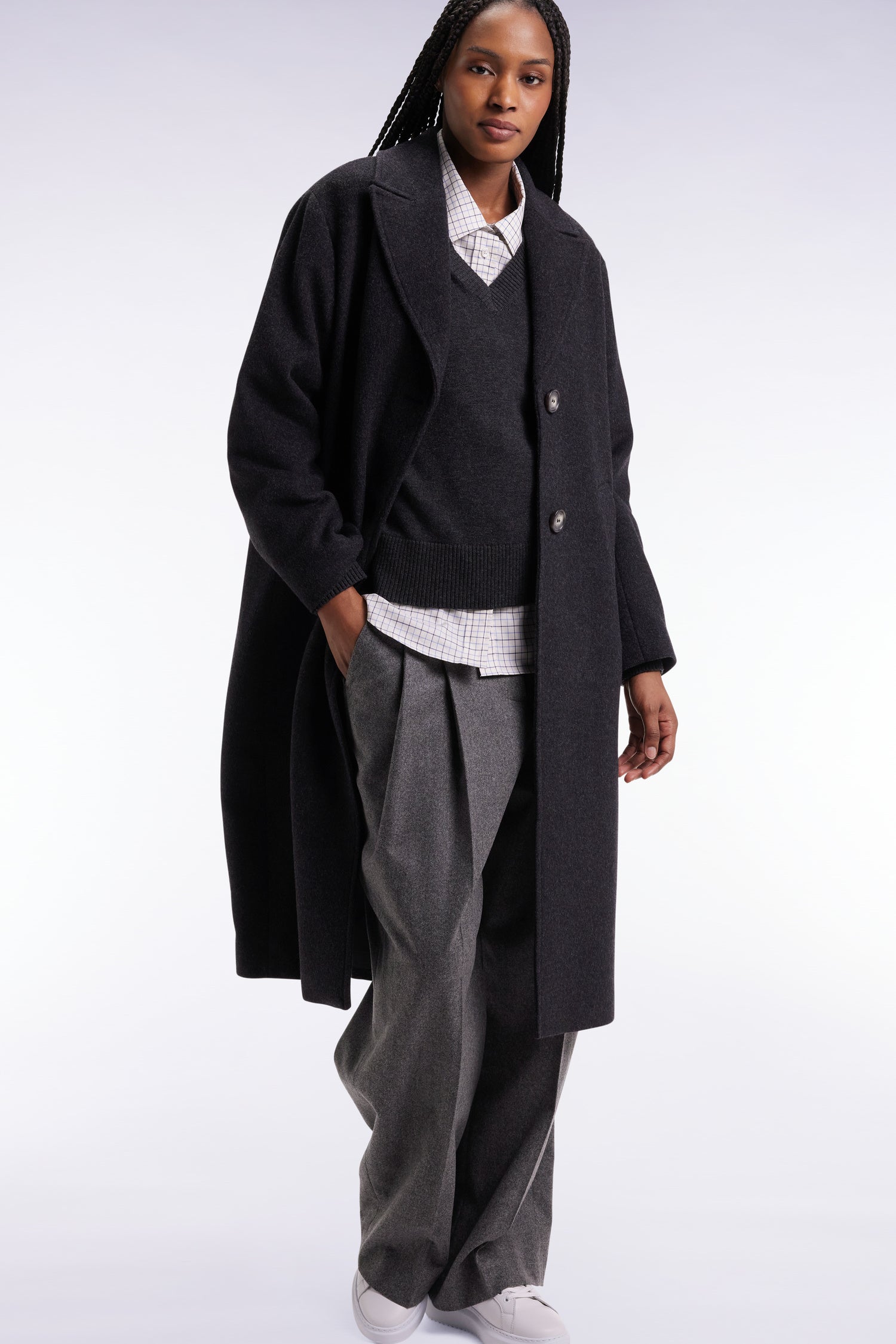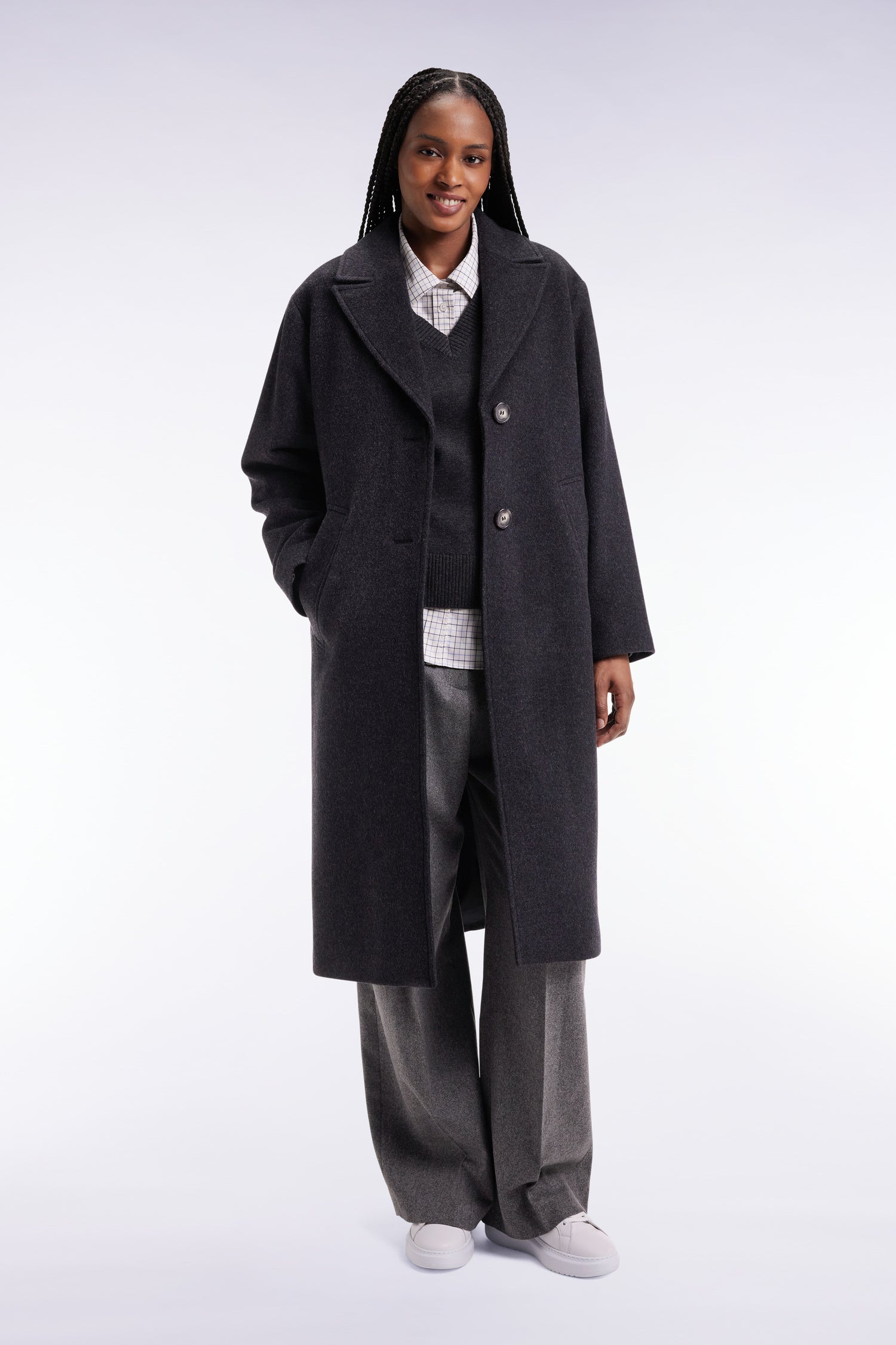Inspiré du vestiaire d'extérieur masculin, ce manteau oversized pour femme affiche une ligne structurée chic et décontractée à la fois. Confectionné dans un double twill de laine gris profond, il présente une coupe droite ample, un col classique orné de notre écusson signature, deux boutons de fermeture apparents et des poches latérales. Une doublure intérieure cerclée de rayures rugby et la forme ovale de ses boutons personnalisés complètent le clin d’œil à l’ADN de notre maison française. Une coupe et des finitions sans compromis qui révèlent tout le raffinement du vestiaire Eden Park.