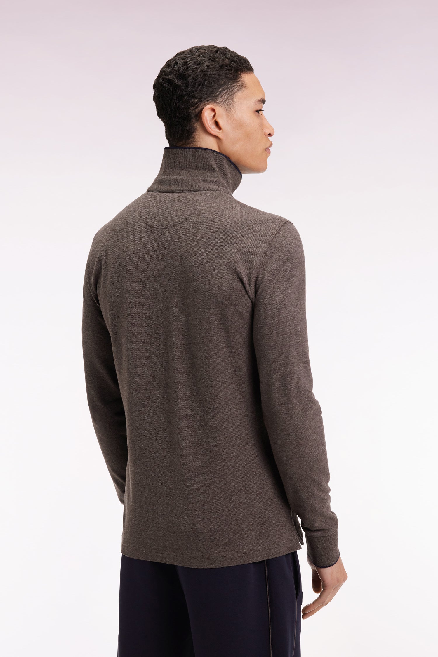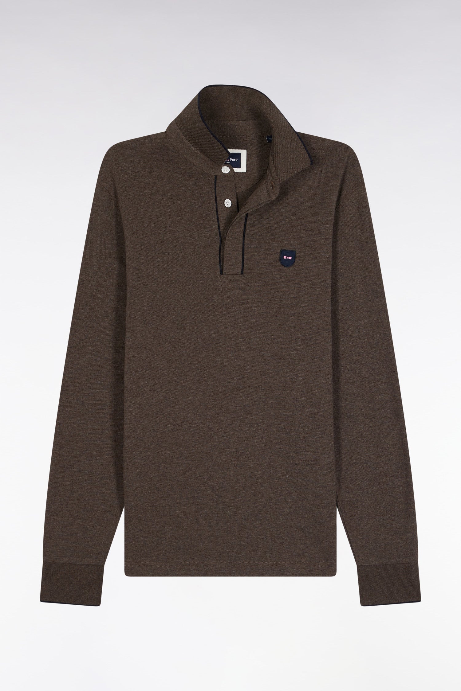Polo à manches longues en coton stretch marron passepoilé coupe slim