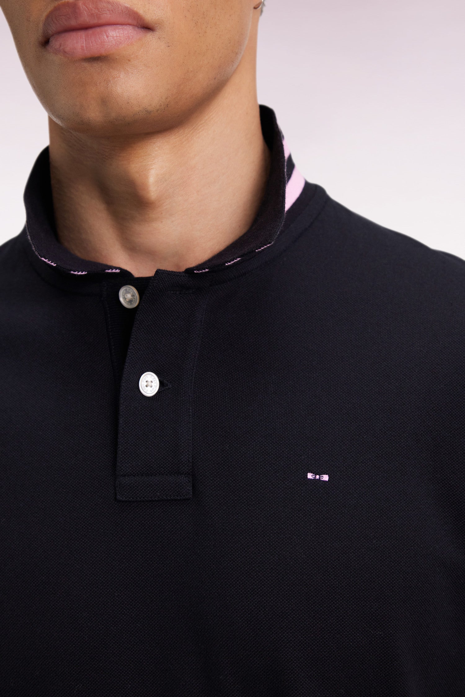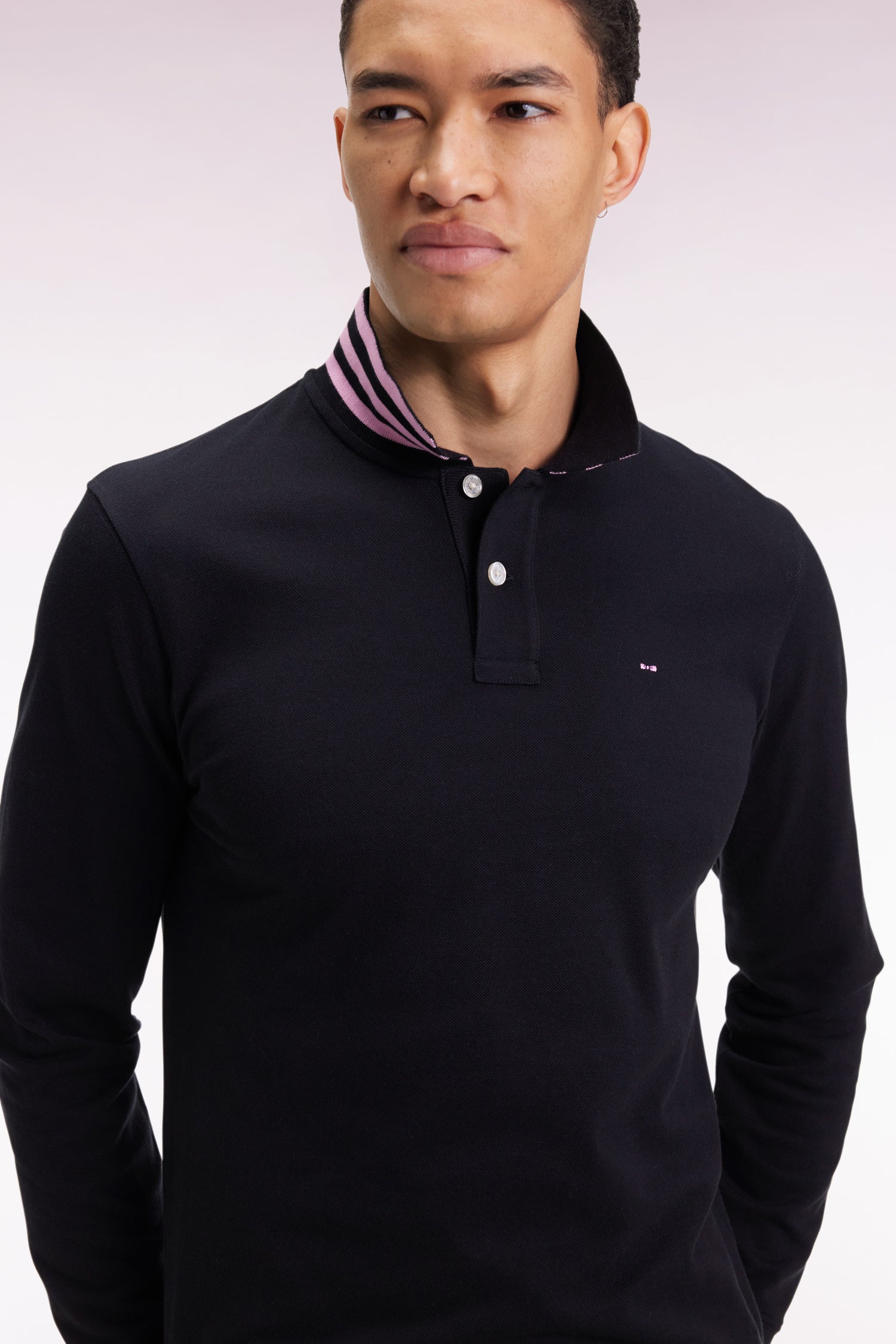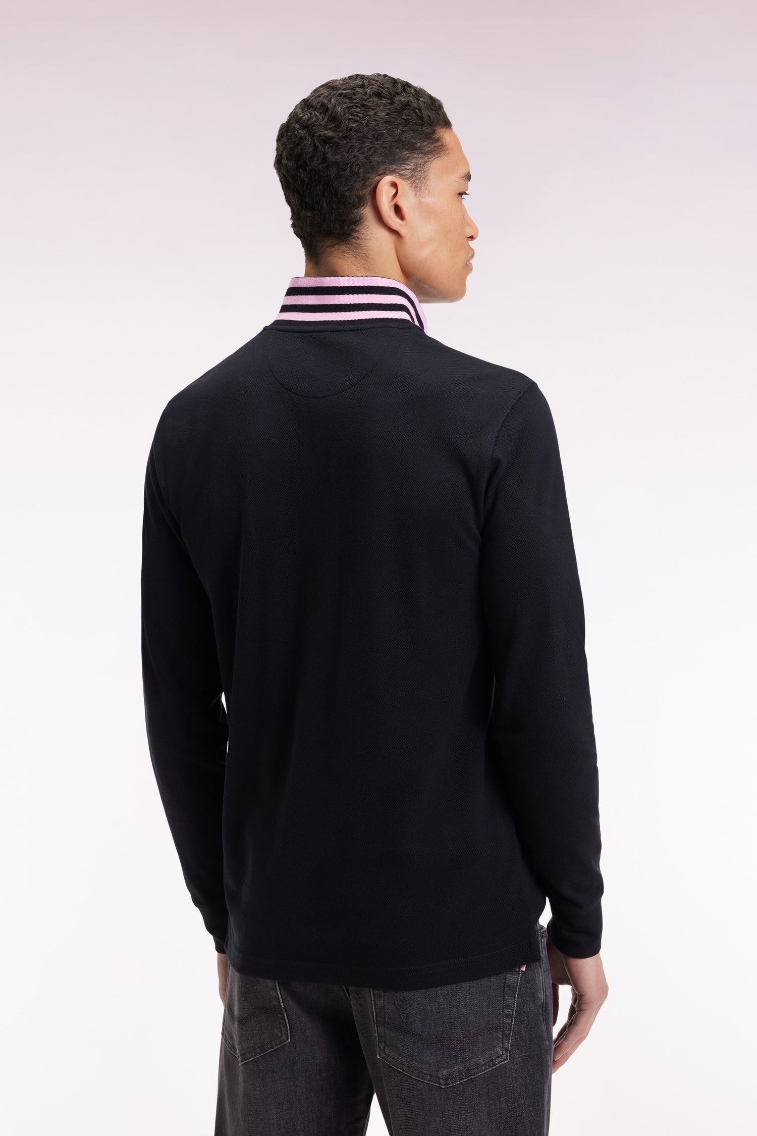 Polo à manches longues en piqué coton noir dessous de col rayé