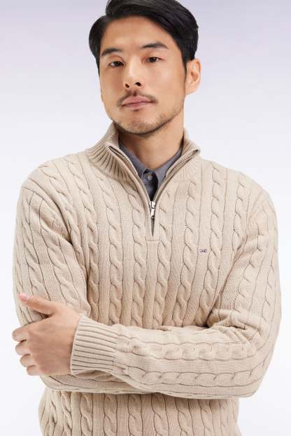Avec son col montant zippé et son jeu de mailles torsadées, ce pull en coton pur adopte une allure preppy des plus tendance. Ses finitions soignées et le travail de tricotage donnent du relief à cette pièce pensée pour conjuguer confort et élégance tout au long de la journée. Proposé en 4 coloris intemporels beige, marine, gris ou marron, ce pull à torsades s'impose comme un incontournable du vestiaire masculin, à porter seul ou superposé à une chemise