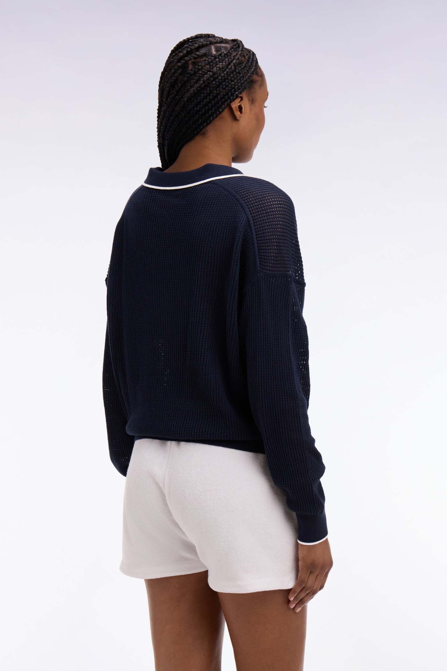 Notre pull col polo à manches longues, proposé en marine ou en blanc, se distingue par sa maille mesh légère qui apporte fraîcheur, relief et modernité. Son caractère est rehaussé par un liseré contrasté au col et aux poignets, ainsi que par le nœud papillon brodé sur la poitrine, emblème de notre Maison. À porter avec un jean clair, un pantalon large ou un short d’été pour une silhouette élégante et effortless quoi que vous réserve le moment.