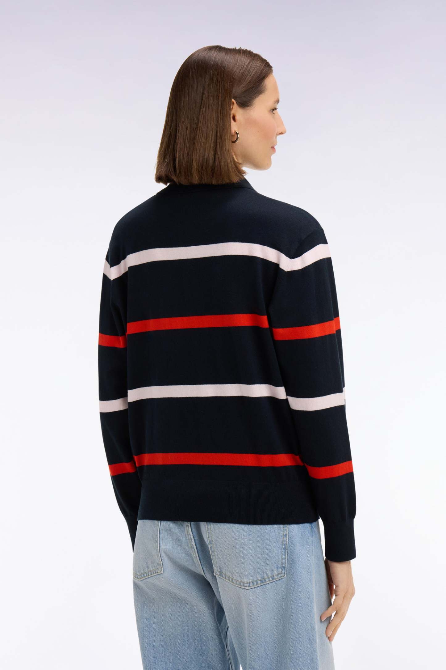 Inspiré des codes du rugby, ce pull à col maillot en maille de coton et soie mélangés séduit par sa douceur et ses rayures graphiques. Sa coupe impeccable et son jeu de rayures structurent la silhouette avec modernité. À porter avec un jean taille haute et notre trench oversized en entrée de saison pour une allure chic et contemporaine, quoi que vous réserve votre journée.