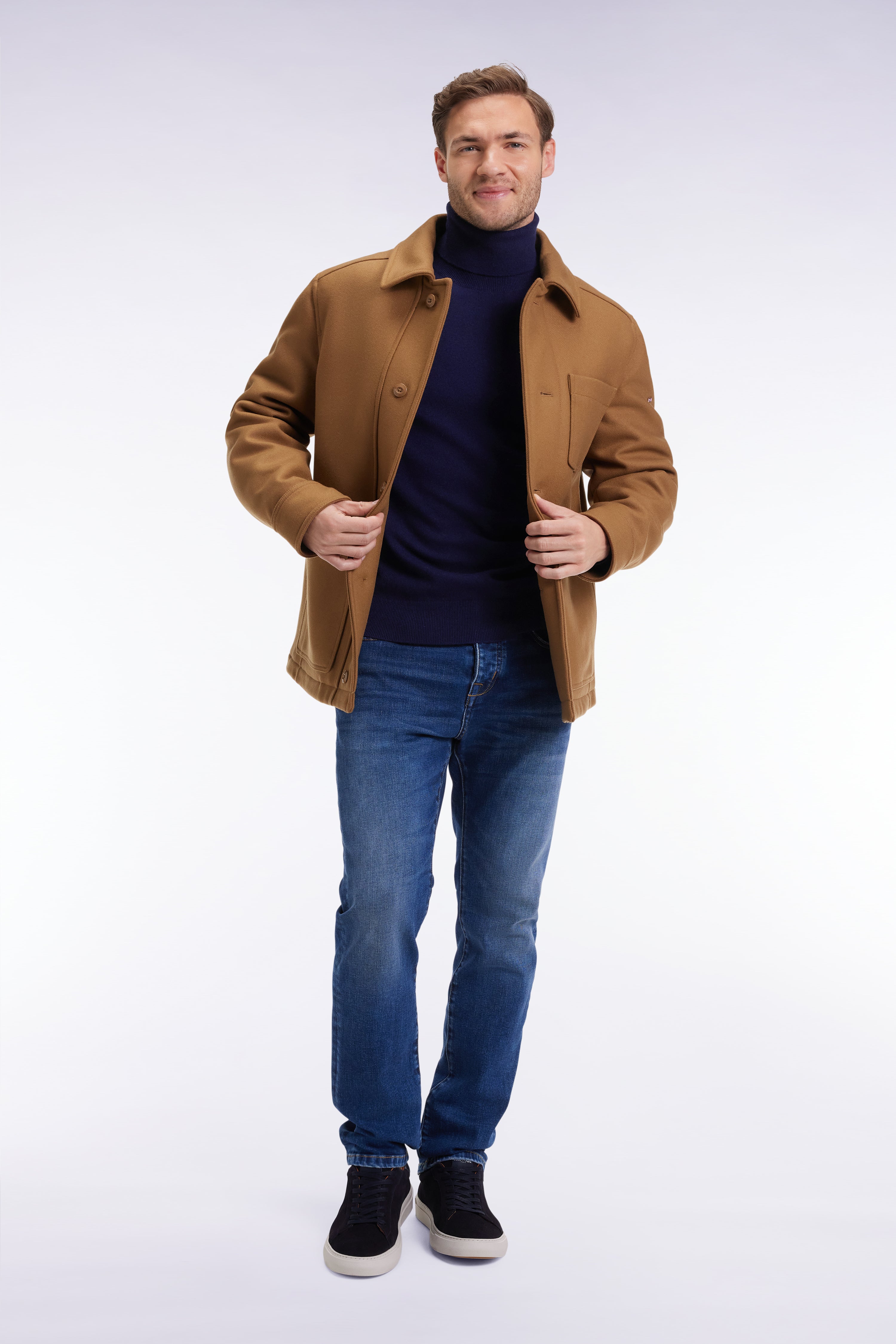 Pensée comme une alternative décontractée à un manteau léger, cette surchemise boutonnée en laine twill se décline en marine ou en camel pour s’adapter à tous les vestiaires. Sa doublure à rayures rugby, clin d’œil aux racines de notre Maison française, contraste avec une silhouette sobre et structurée. Trois poches plaquées, des boutons rugby personnalisés et l'emblème nœud papillon en gomme font partie de ses nombreuses finitions soignées. Une pièce intemporelle, idéale pour accueillir les premiers froids ou prolonger la saison avec élégance jusqu'à l'arrivée des beaux jours