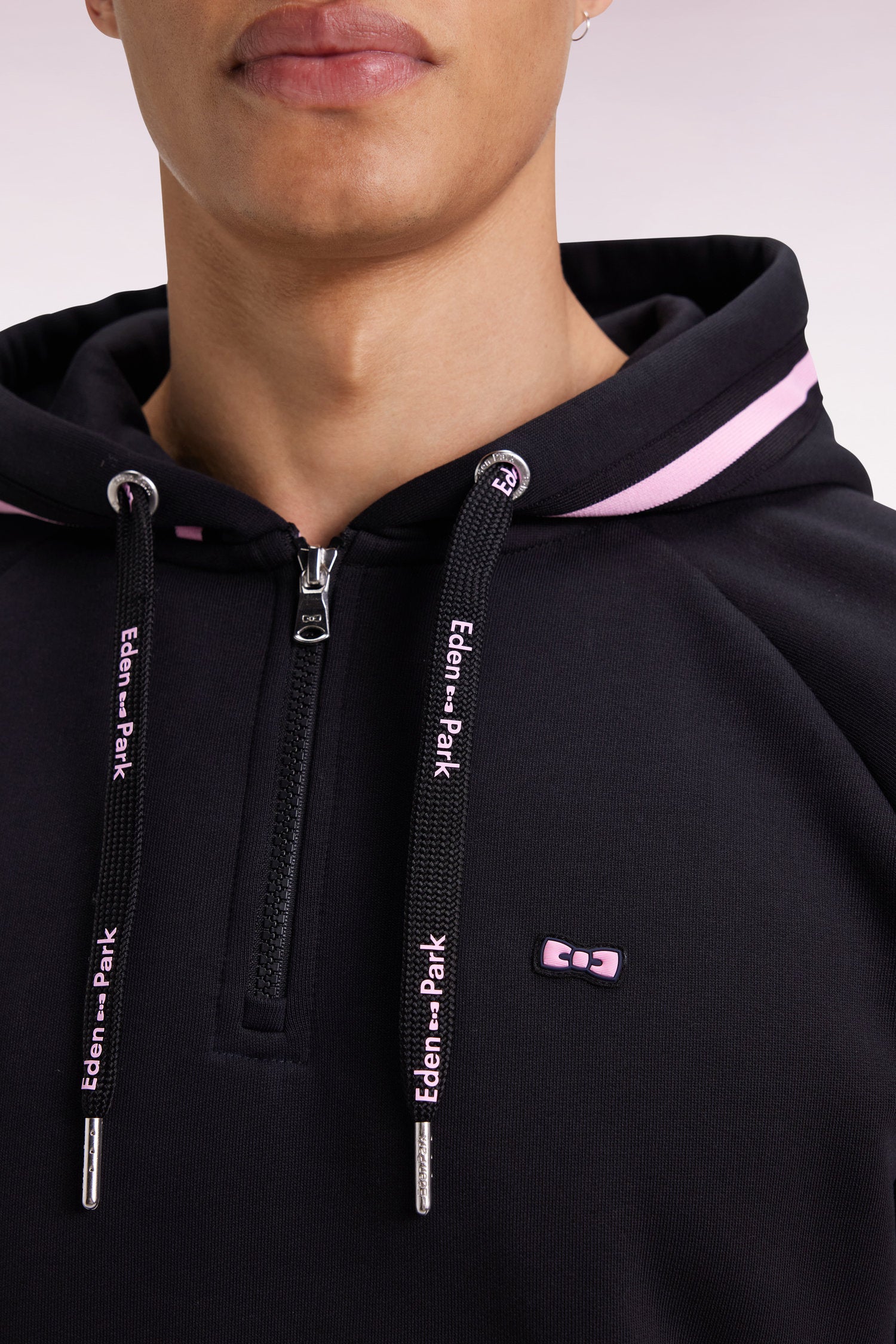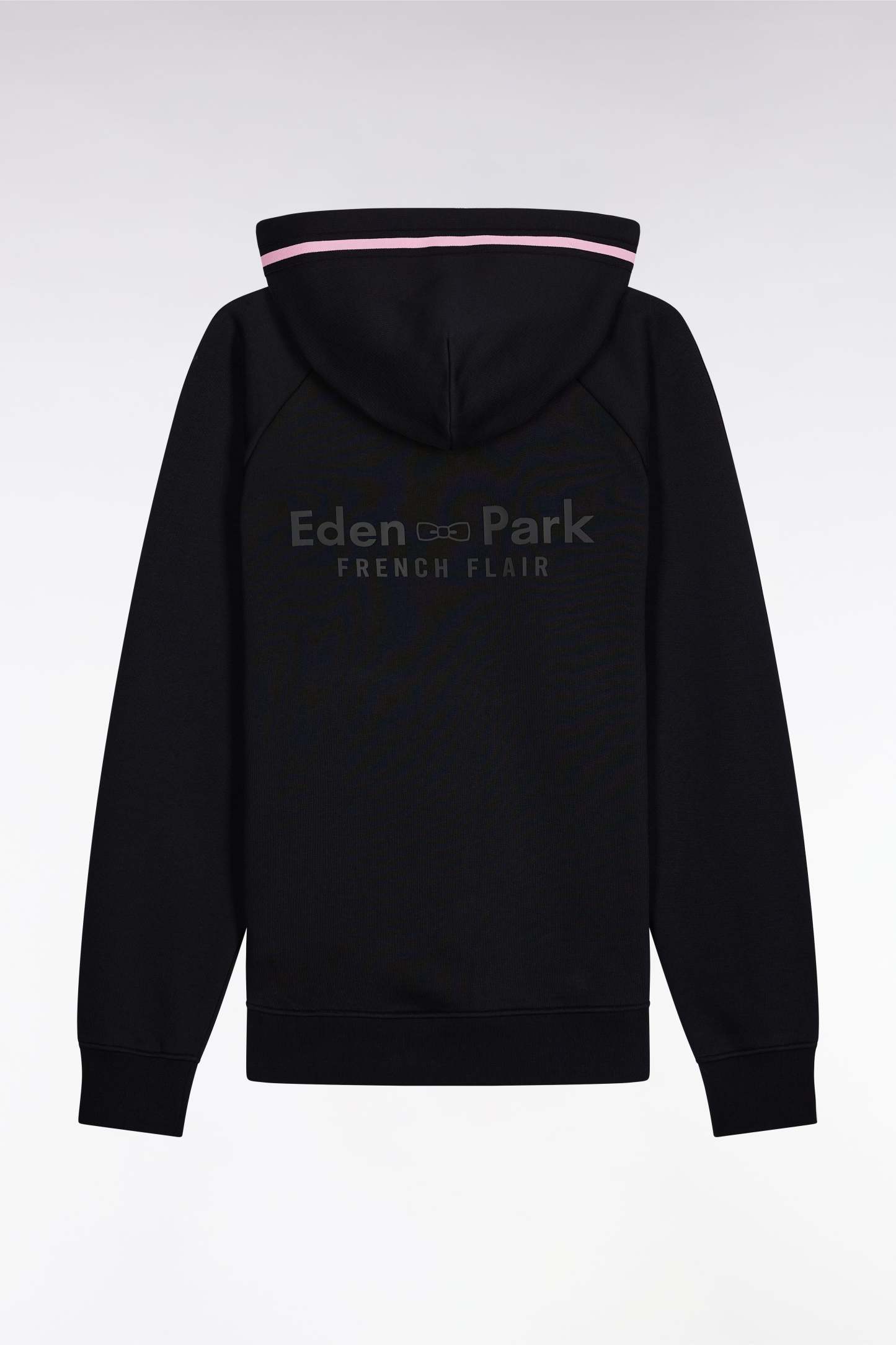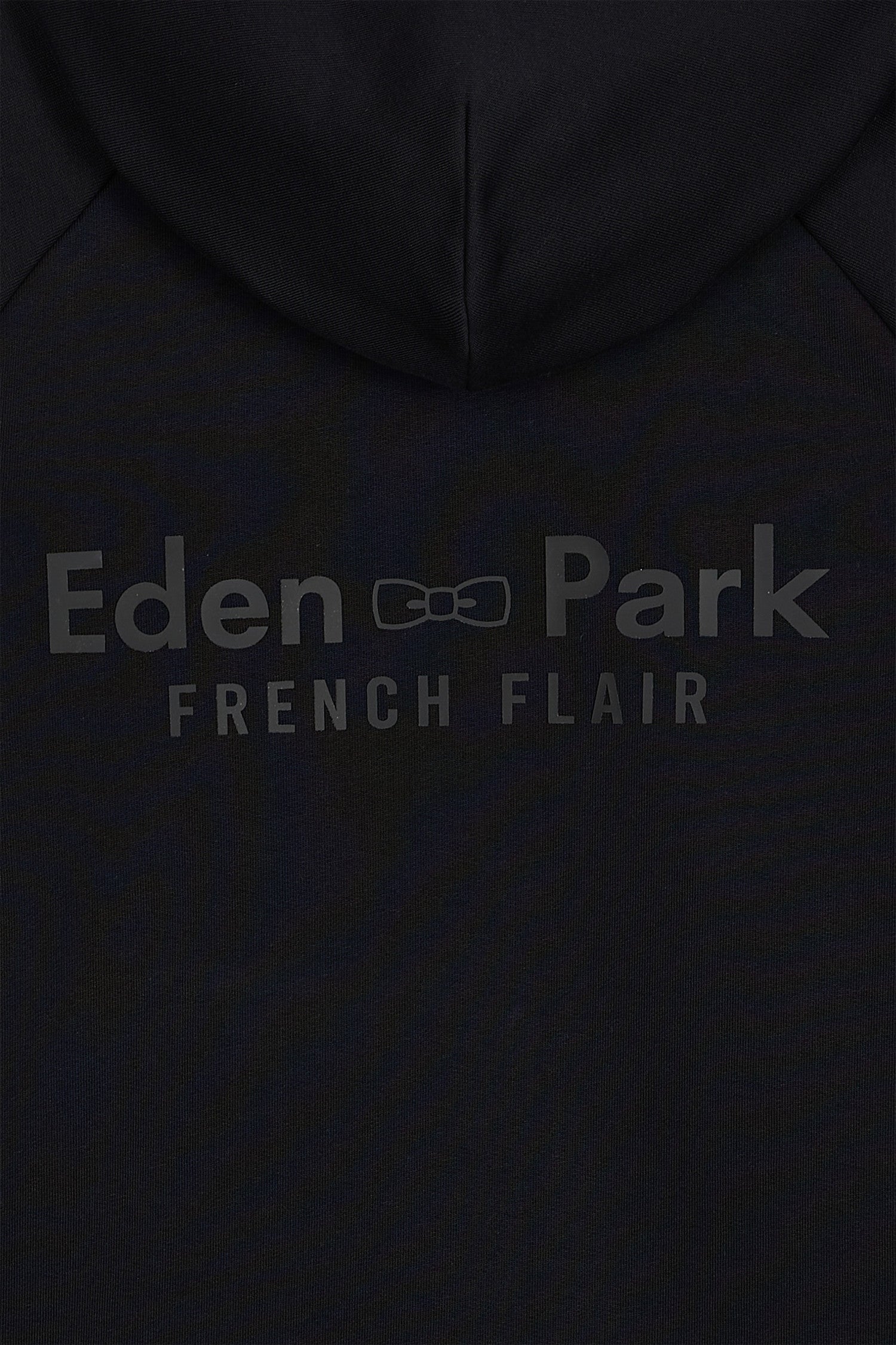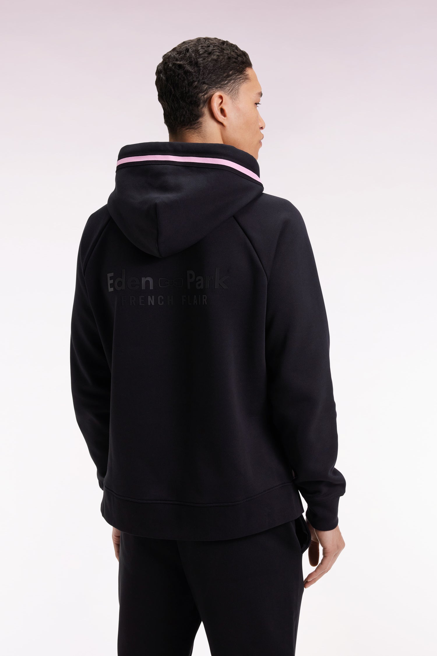 Ce sweatshirt à capuche semi-zippé façon col camionneur s’impose par son style affirmé et son jersey lourd au tombé impeccable. Les fentes latérales, rehaussées d’un ruban tricoté rayé, apportent une touche graphique, tout comme le contour de capuche contrasté. Une impression ton sur ton au dos signe la pièce avec caractère. Le cordon personnalisé au logo Eden Park et les finitions métalliques parachèvent ce modèle au style urbain des plus tendance offert dans une coupe ample