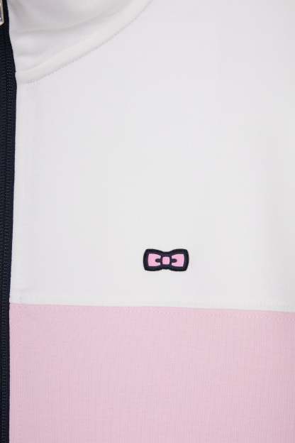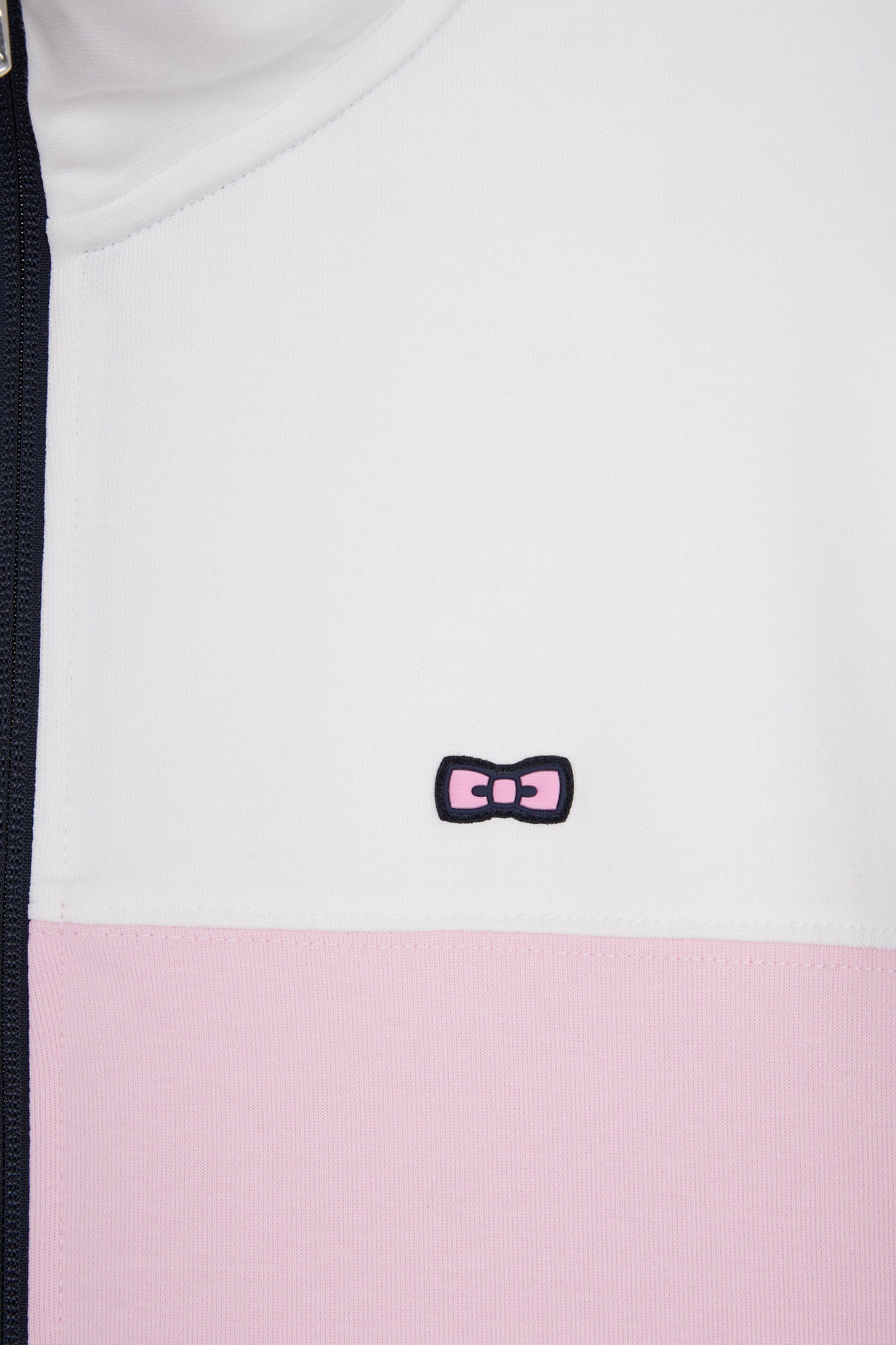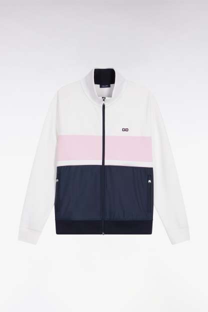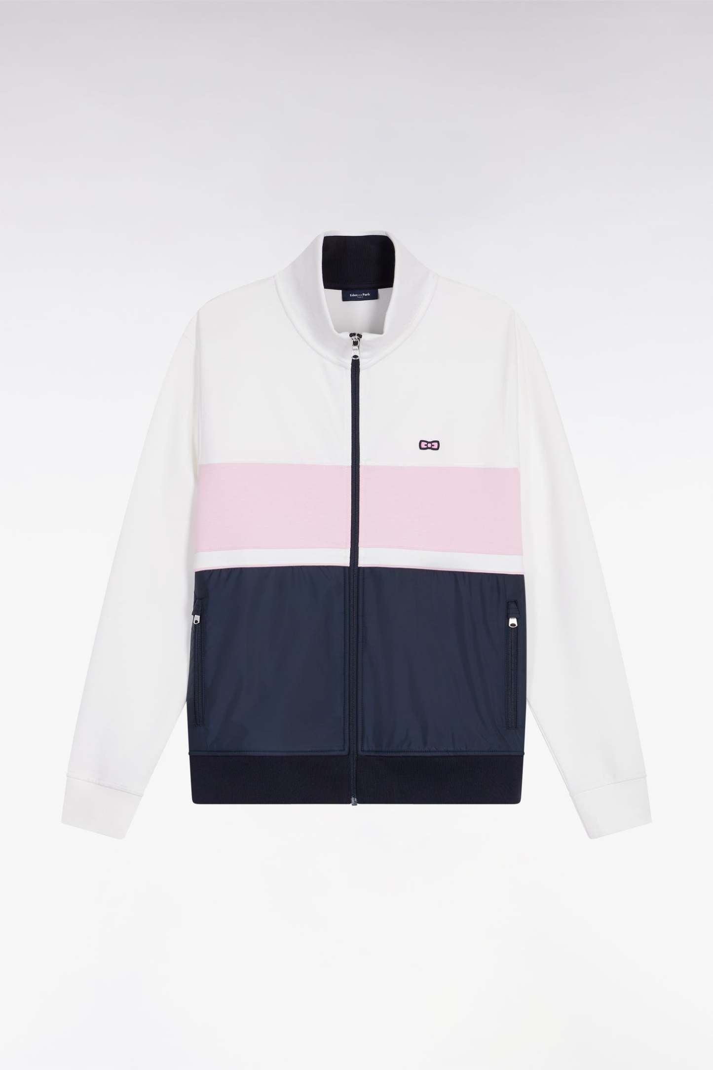 Ce sweatshirt zippé à col montant mise sur une construction tricolore équilibrée et des jeux de matières subtils. Le haut en molleton blanc cassé est rehaussé d’une bande rose pâle, tandis que le bas contraste en nylon marine, apportant structure et modernité. Se porte en sweatshirt comme en veste de mi-saison