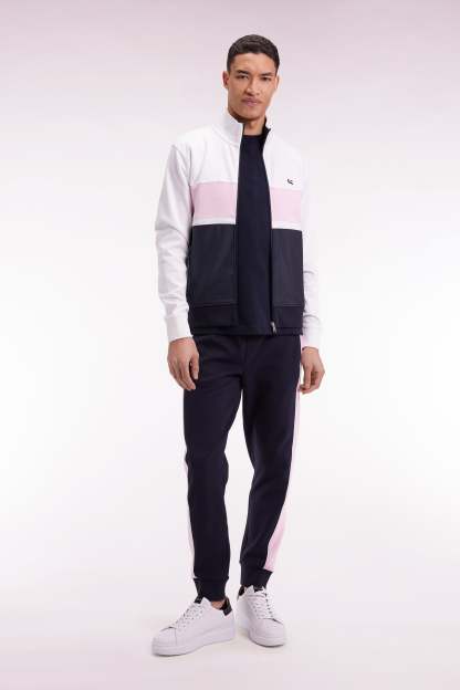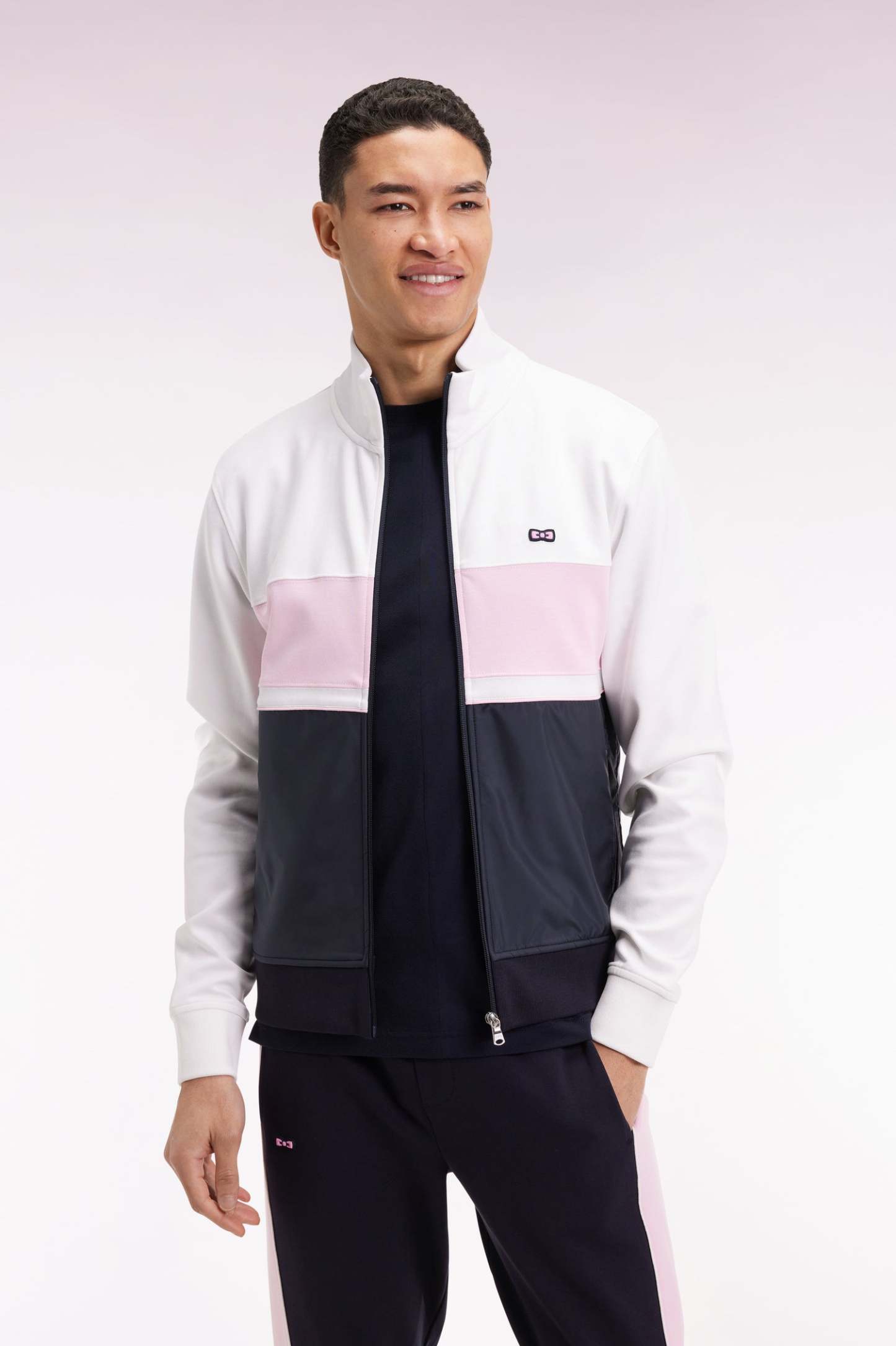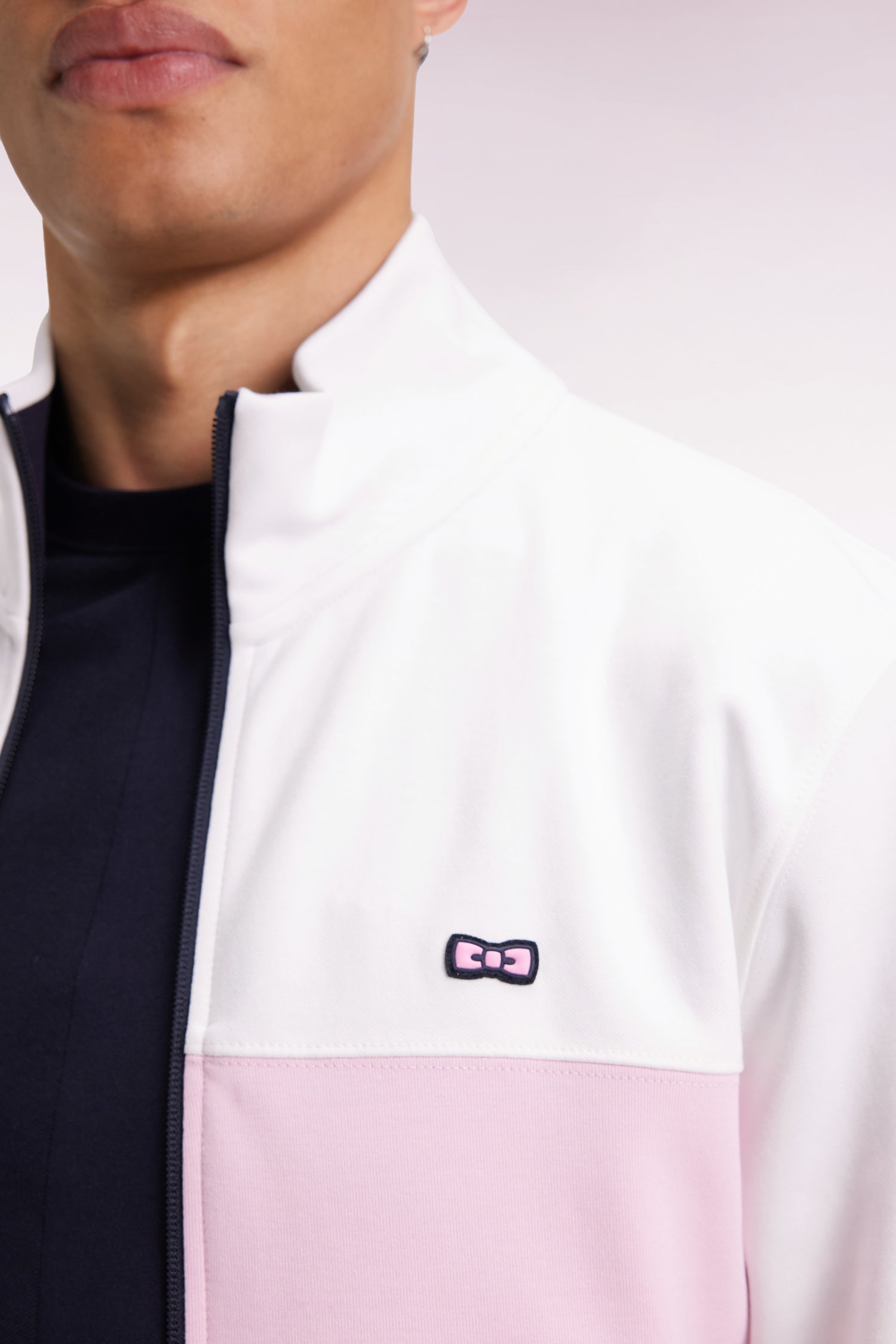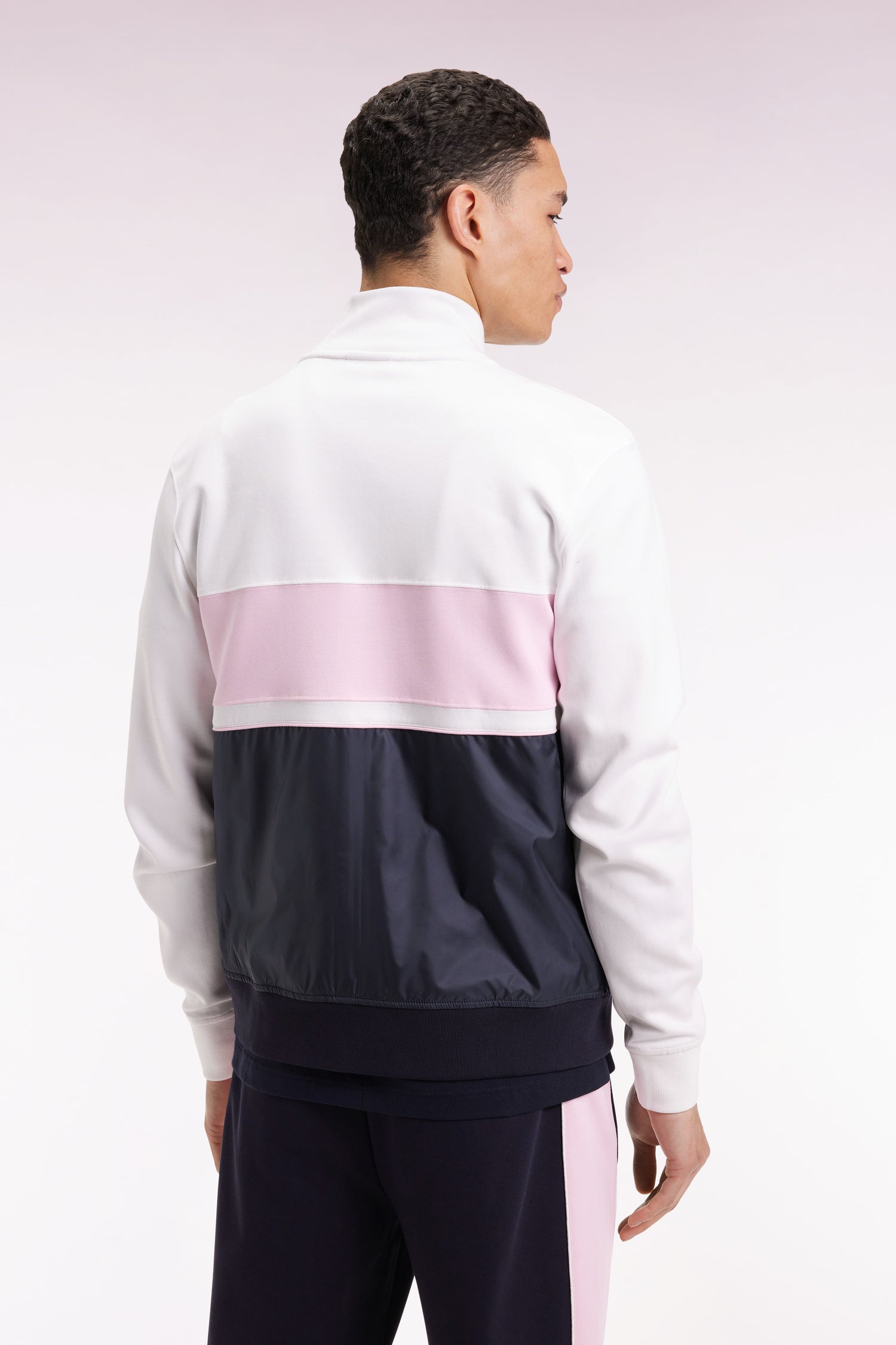 Ce sweatshirt zippé à col montant mise sur une construction tricolore équilibrée et des jeux de matières subtils. Le haut en molleton blanc cassé est rehaussé d’une bande rose pâle, tandis que le bas contraste en nylon marine, apportant structure et modernité. Se porte en sweatshirt comme en veste de mi-saison