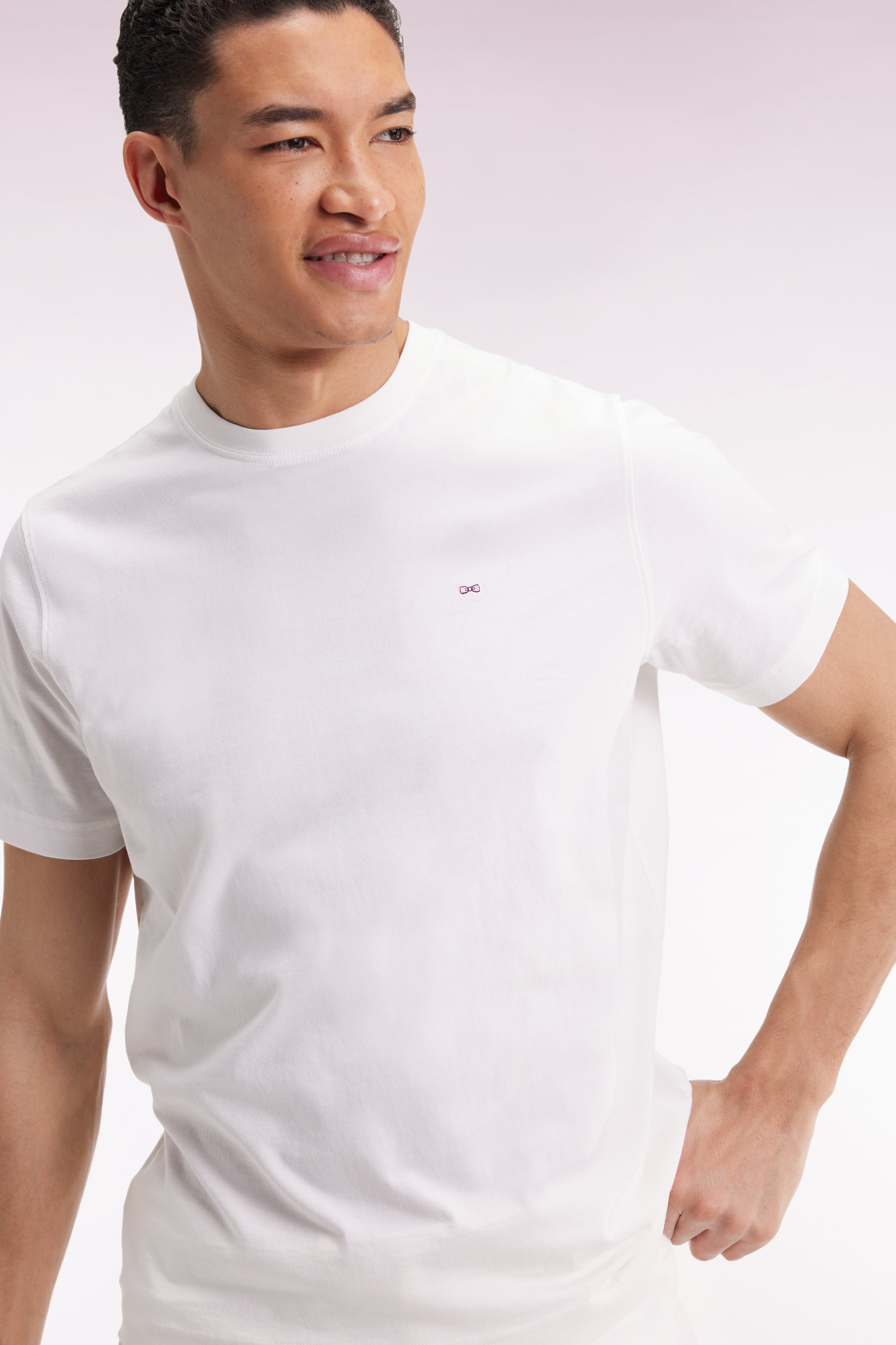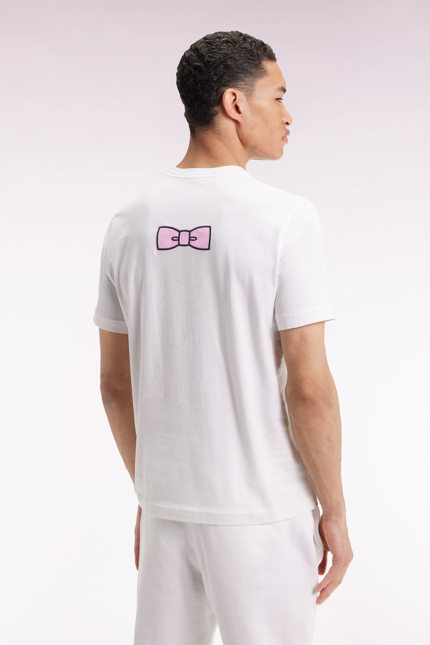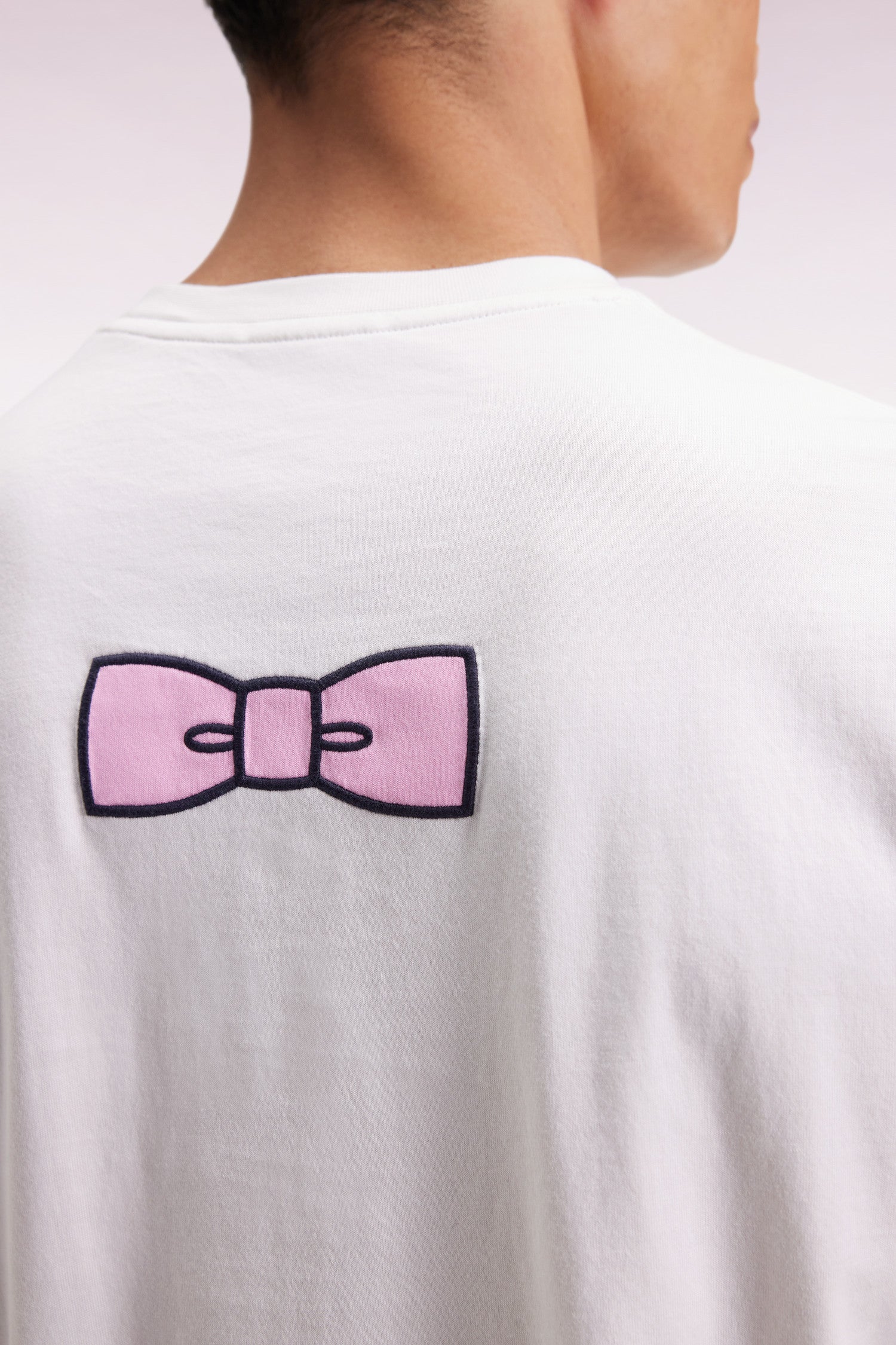 Réalisé en jersey de coton Pima, ce T-shirt à col rond allie confort et raffinement. Une petite broderie rose orne discrètement la poitrine, tandis qu’un large nœud papillon brodé dans le dos affirme l’identité French Flair de ce modèle. Un essentiel twisté avec audace pour le quotidien