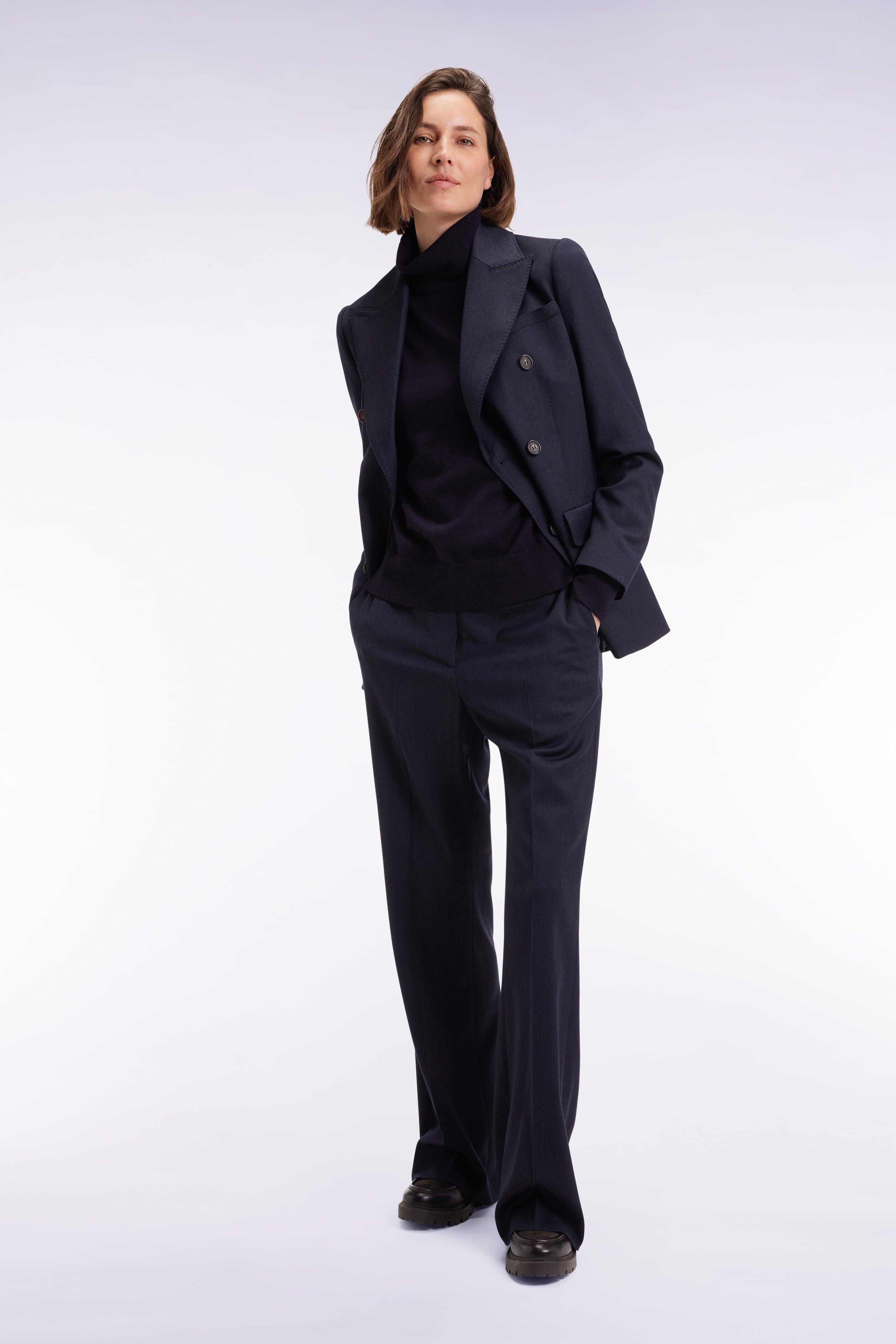 Ce blazer cintré revisite les codes du tailoring féminin dans une flanelle subtilement rayée au tombé parfait. Son étoffe en laine stretch mélangée offre confort et souplesse au porter, sans rien céder au raffinement. Dotée d’un col smoking et d’un double boutonnage ton sur ton, cette veste de costume femme structure la silhouette. Les poches à rabat viennent parfaire l’allure. À associer au pantalon flare assorti ou à détourner en l'associant à un jean large
